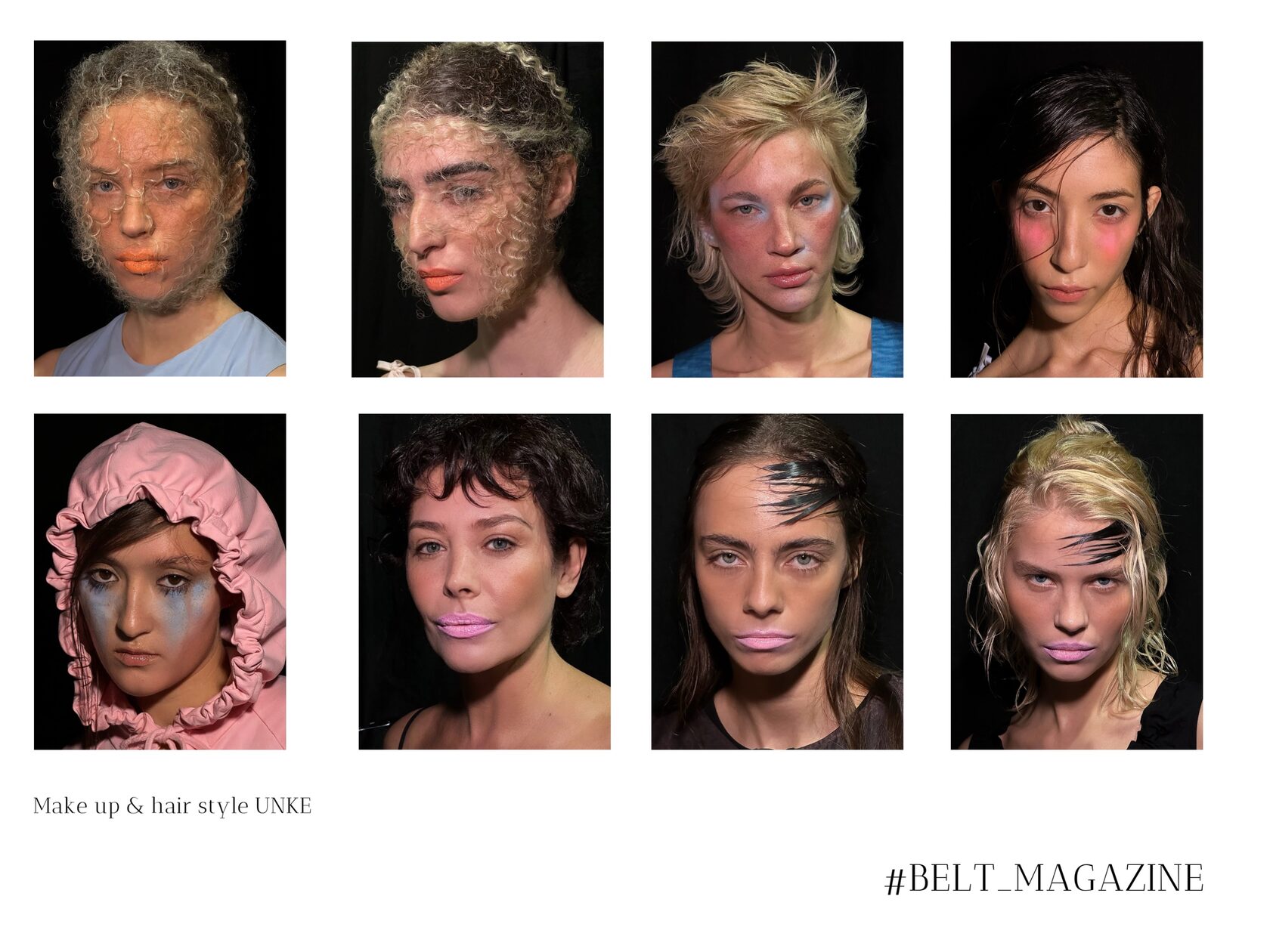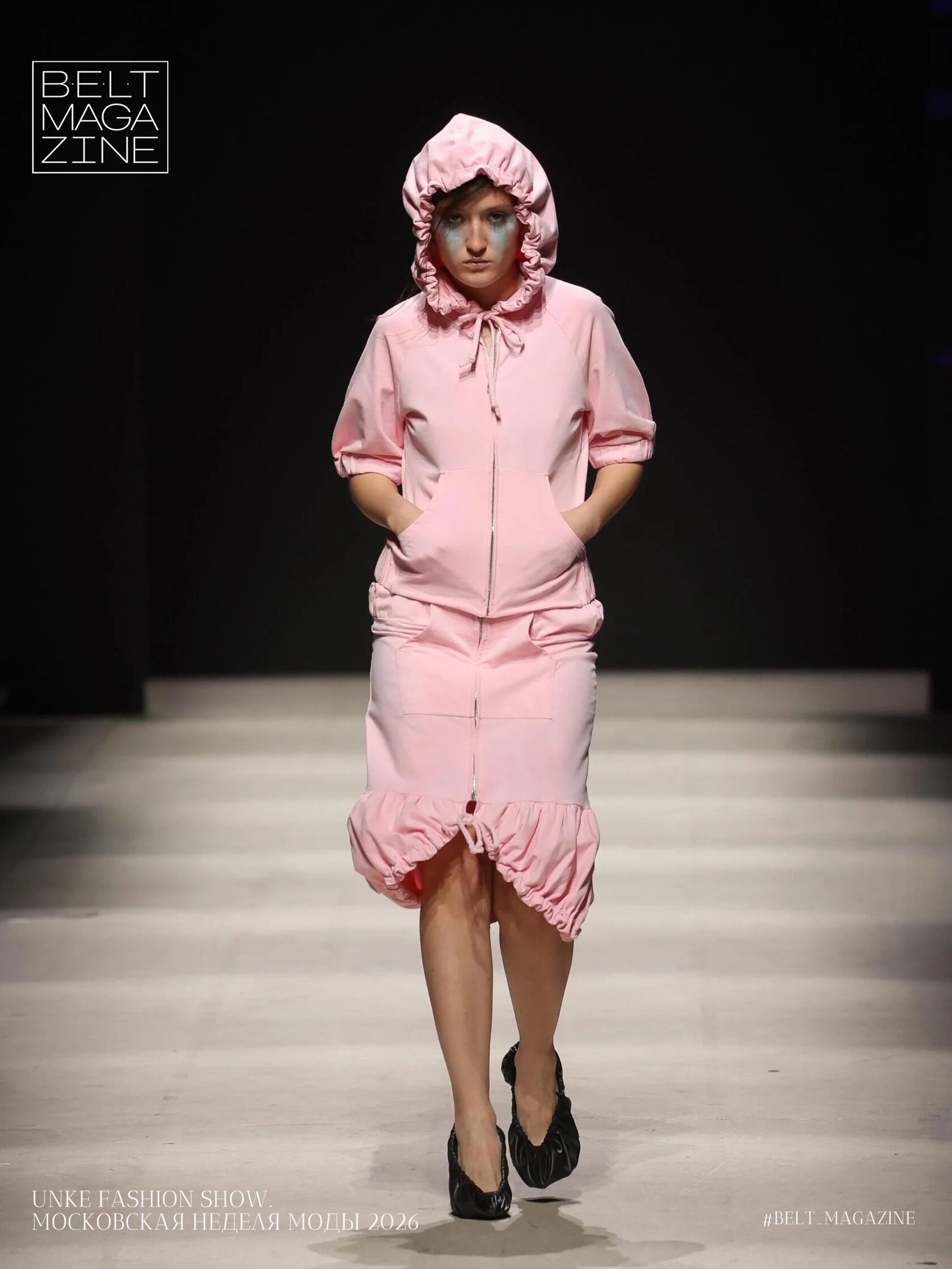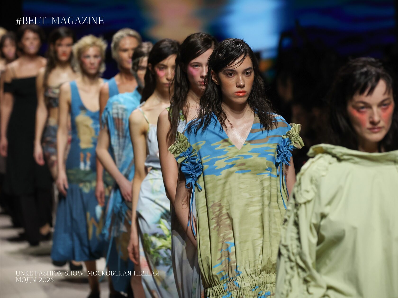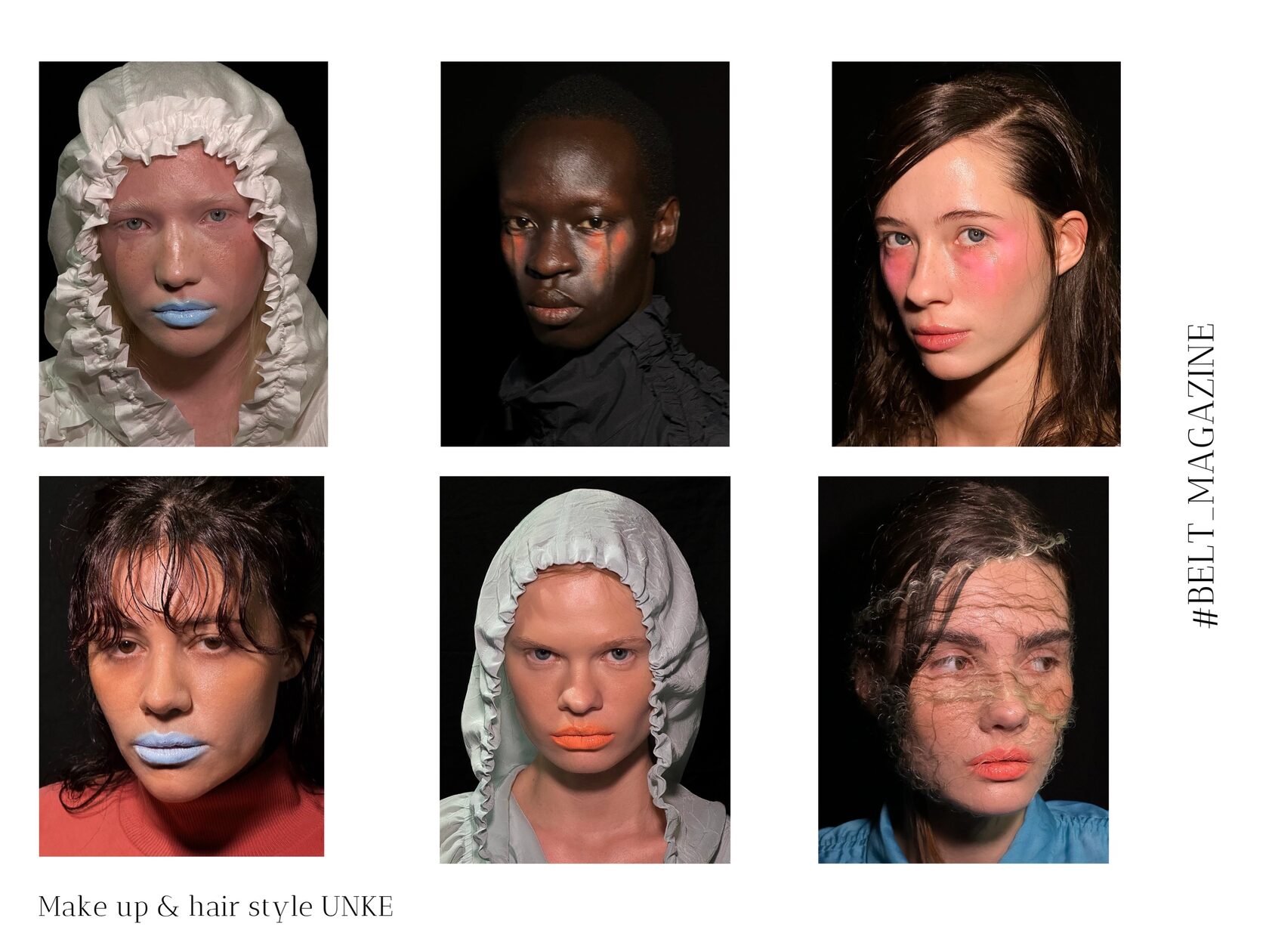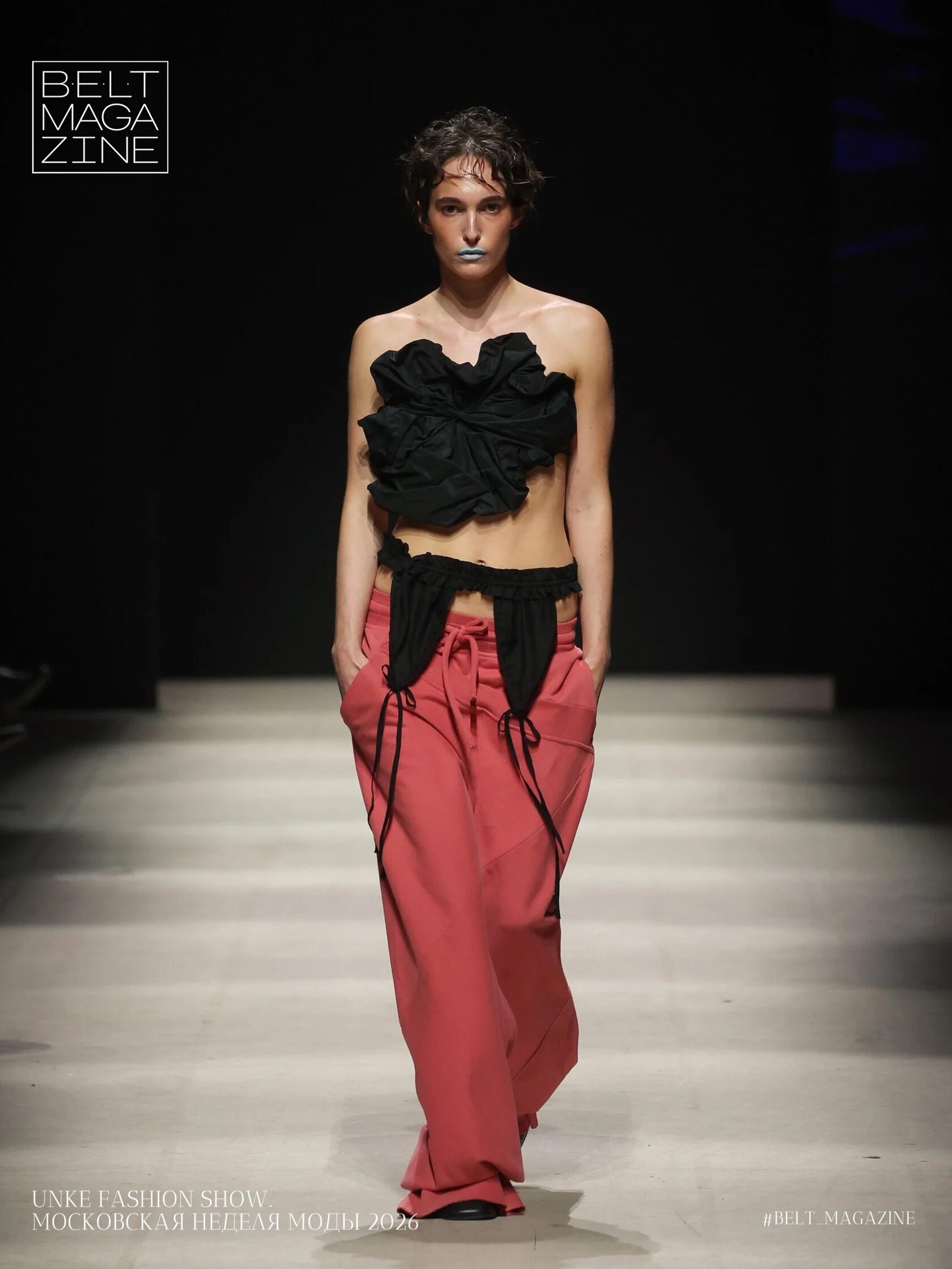 Очень важный фактор в показе коллекции — бьюти-составляющая, которая помогает раскрыть концепцию и погрузить зрителей в атмосферу. В этом сезоне Unke выбрали макияжи с акцентом на губах, цветные разводы под глазами и растрепанные волосы.