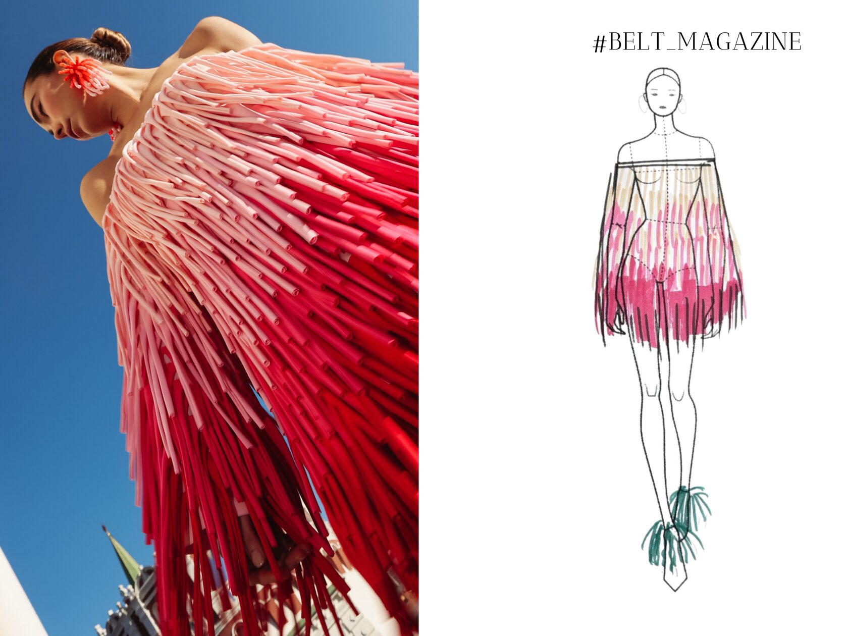 "Мое самое любимое — оно же олицетворяет цветовое сочетание знака буддийского дацана. Это самый яркий, самый динамичный образ, я отдаю ему предпочтение. Также люблю топ с «пампушками» (на самом деле он называется топ с меховыми бусинами) — он тоже очень динамичный и красивый. И еще платье в бордовом цвете с оплечьями и бахромой, напоминающей цветок астры, и тонкими трубками из морских актиний, которые были еще в прошлой коллекции".