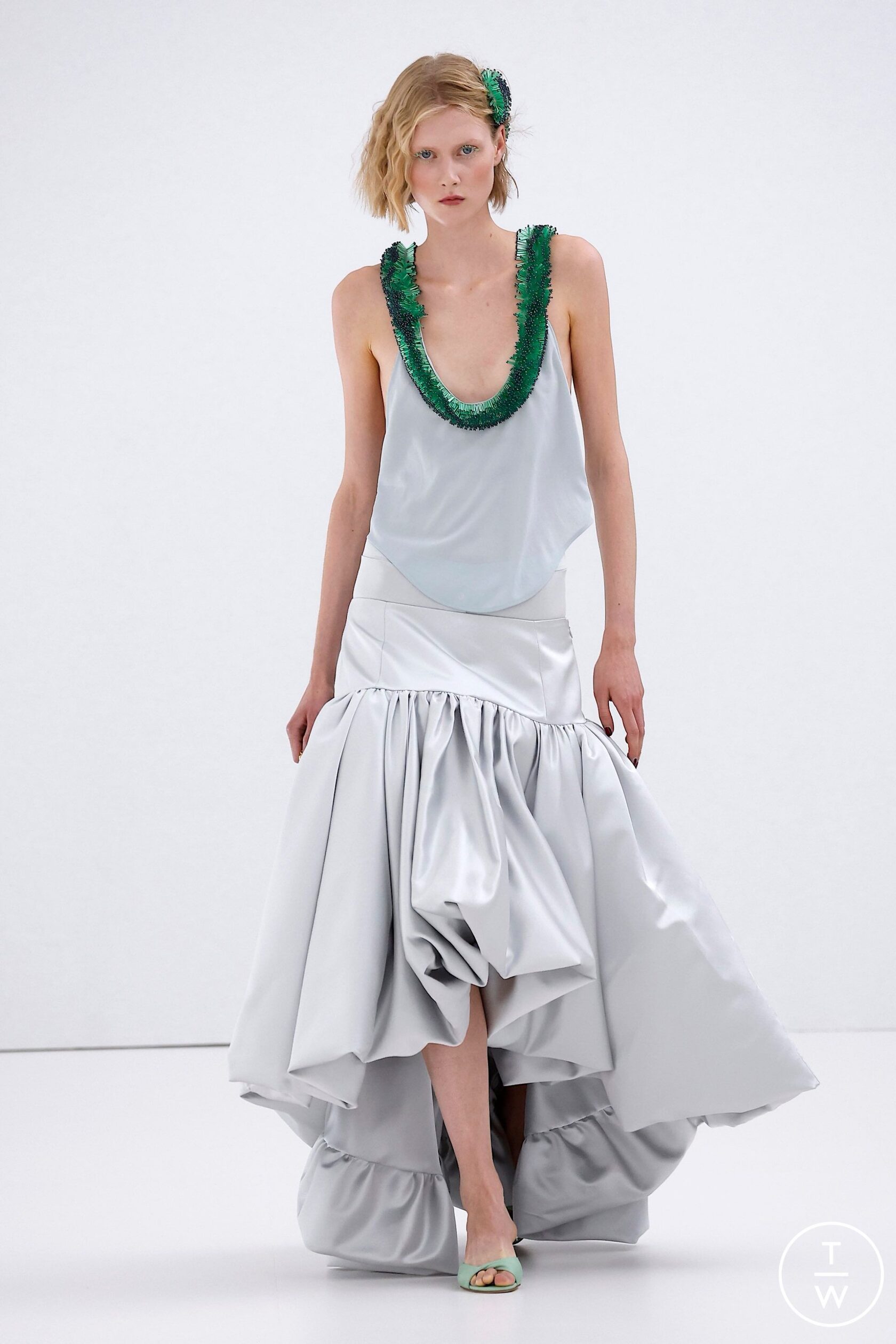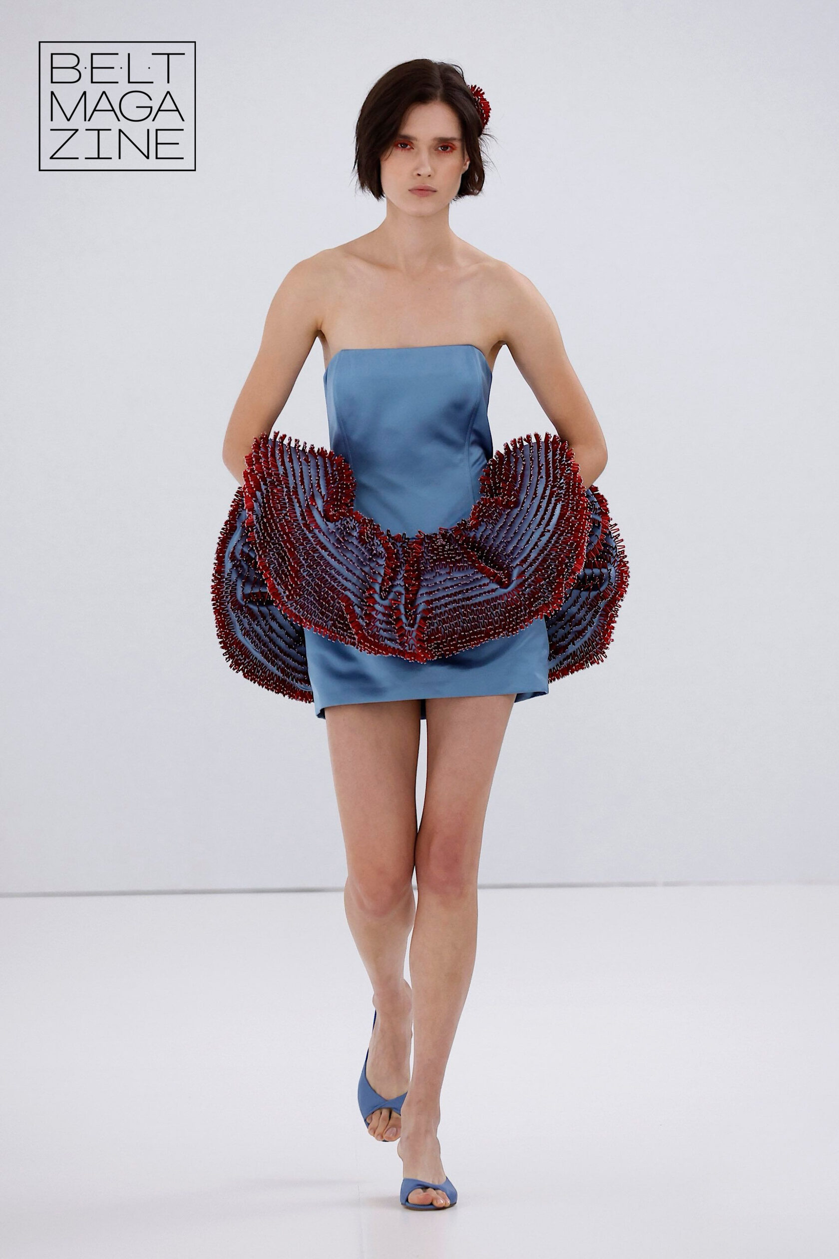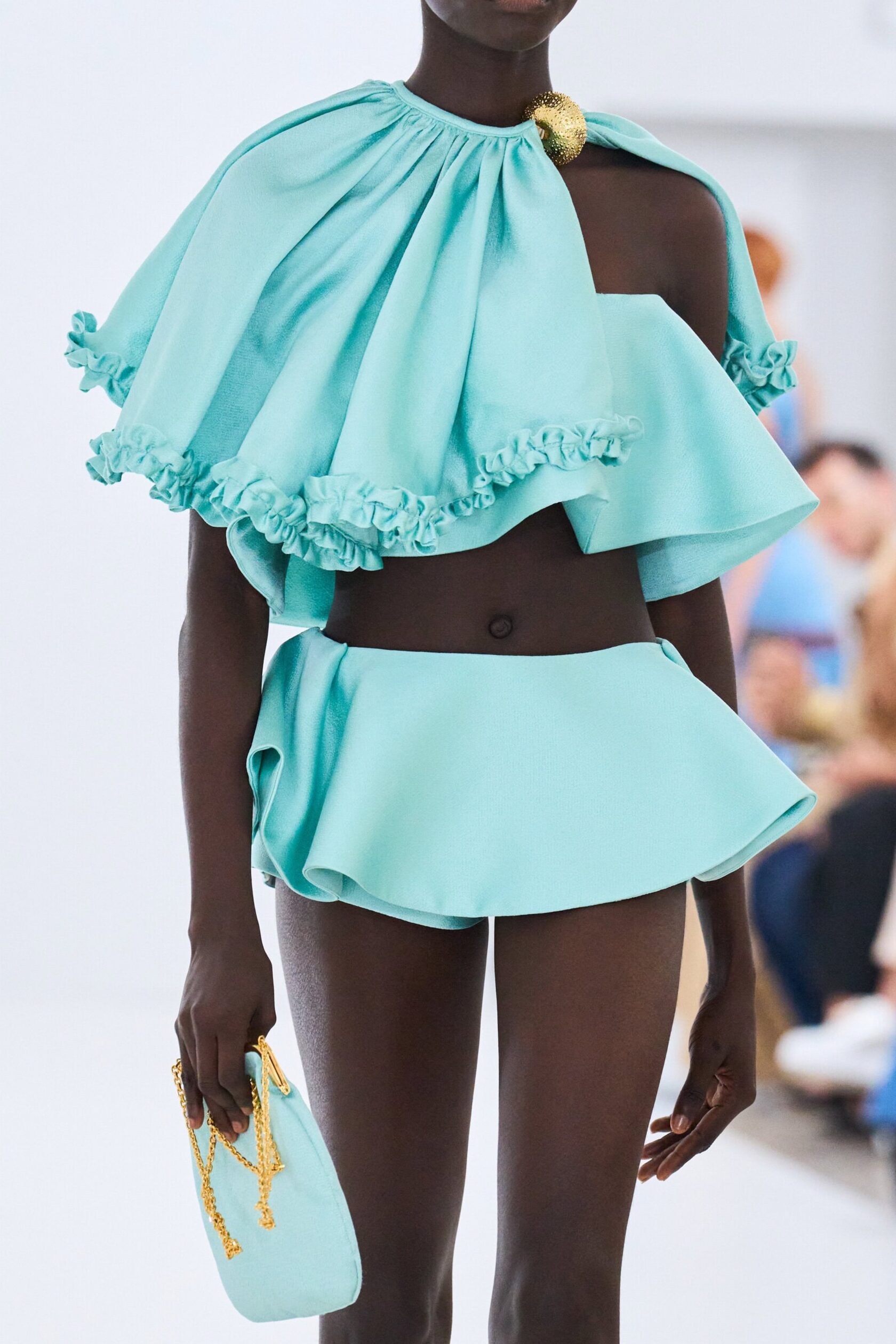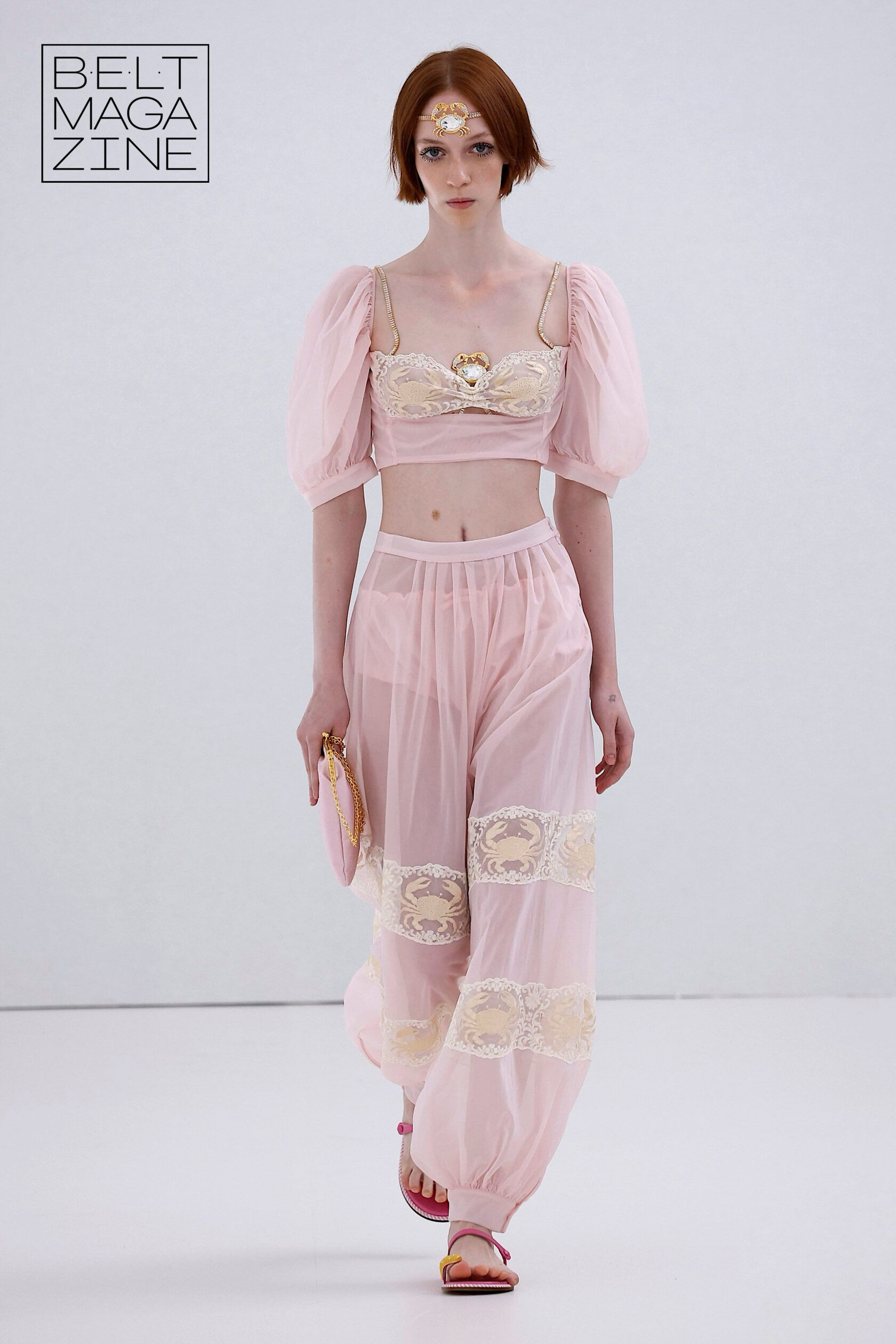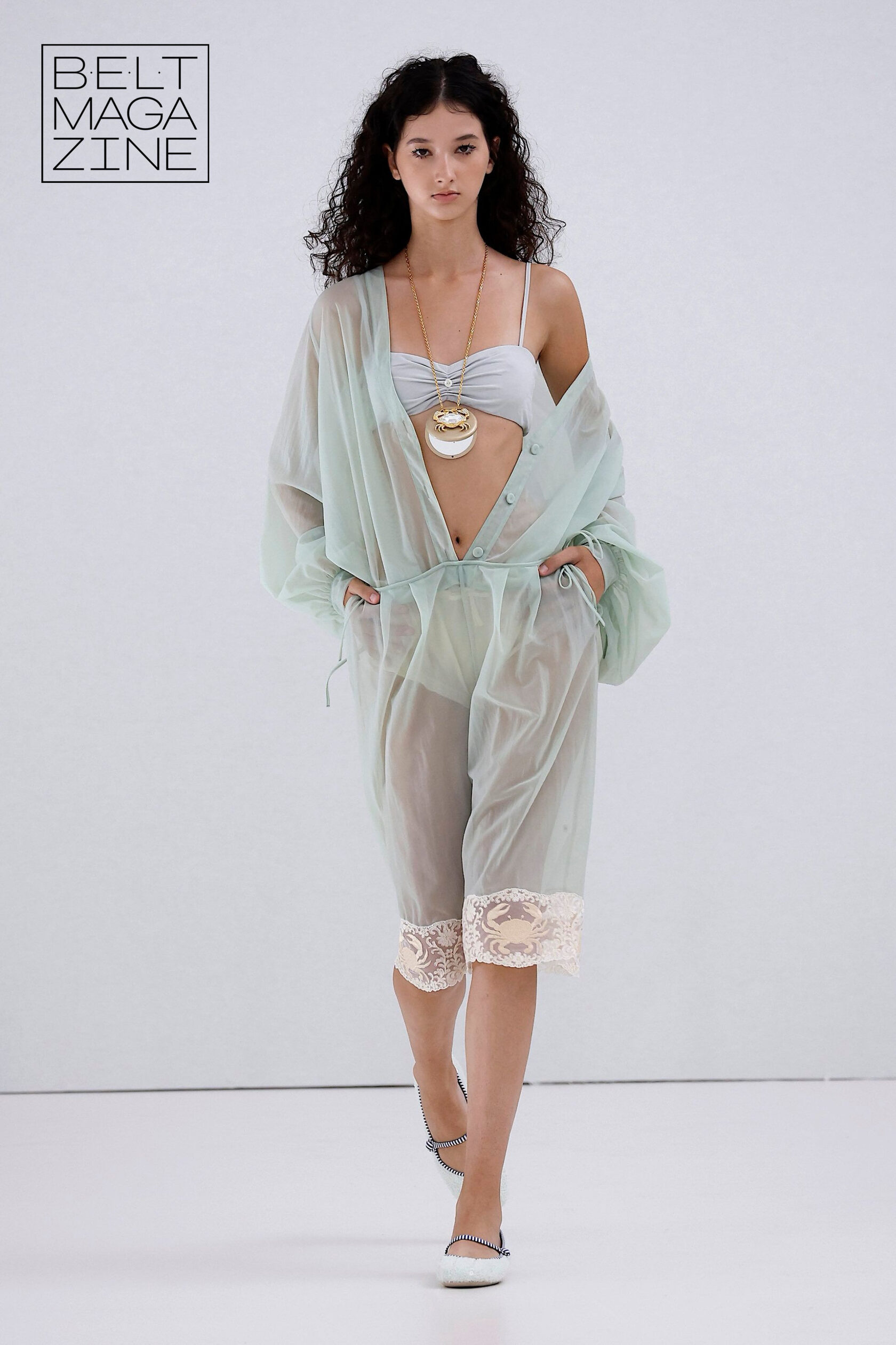 При всем при этом в коллекции отслеживается беби-дол эстетика и легкая кокетливость: прозрачные платья, укороченные топы, платья с завышенной талией.
