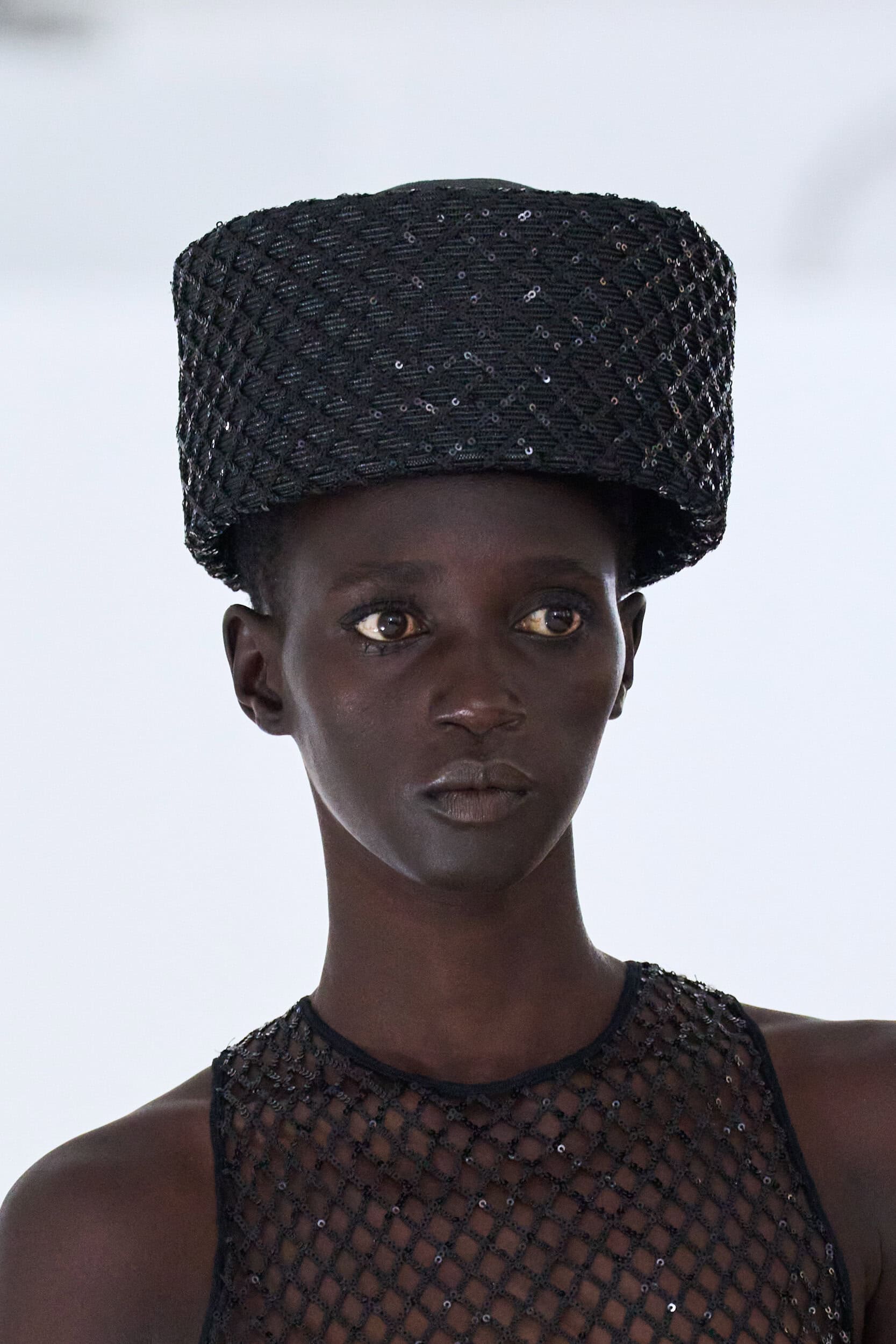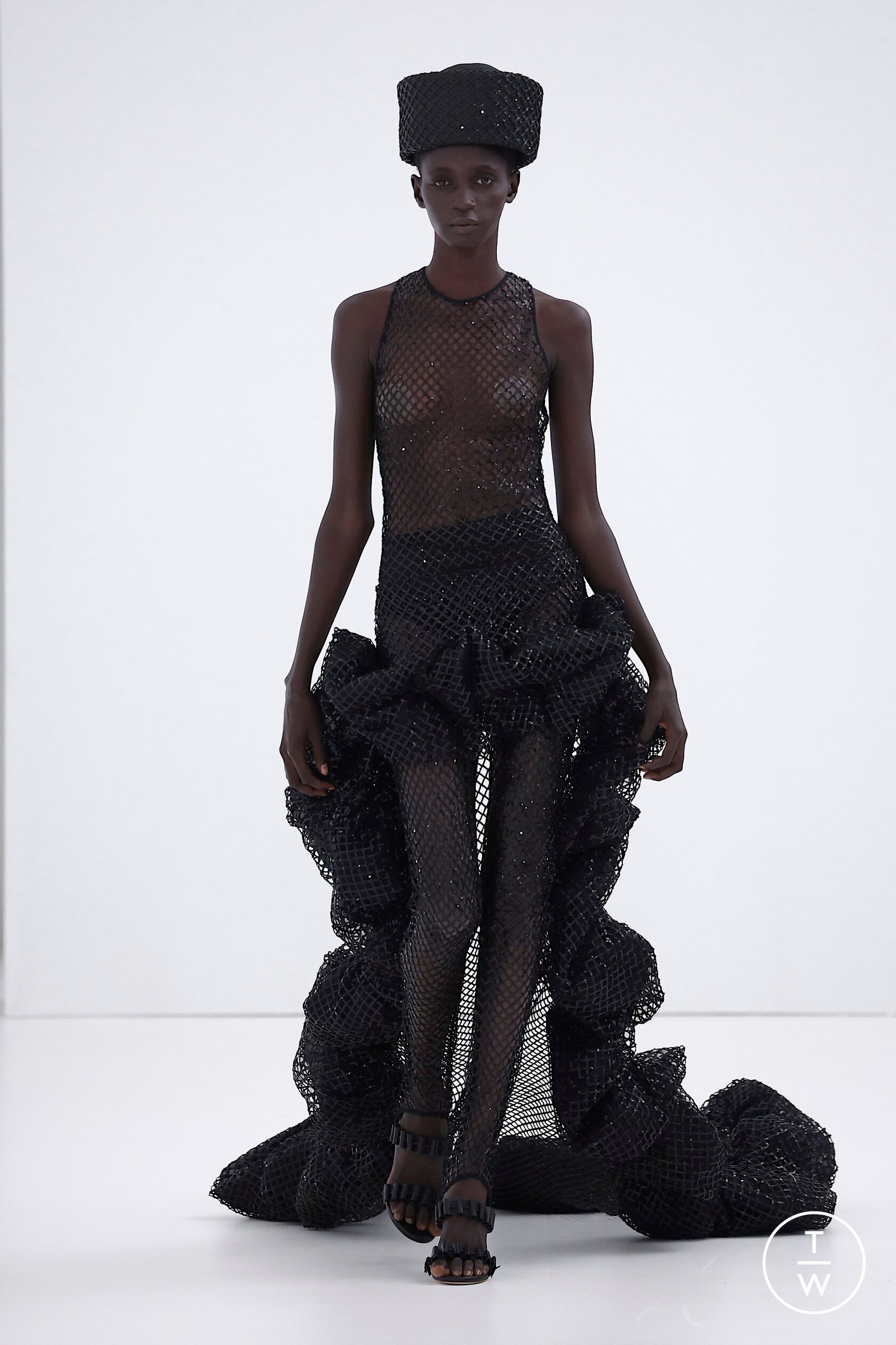 Самый эффектный по нашему мнению образ. Длинное черное платье из сетки с пышной юбкой идеально подчеркивает тему коллекции. Головной убор добавляет ему строгости, но за счет сетчатого материала и все равно создается ощущение легкости и платье не кажется «тяжелым».