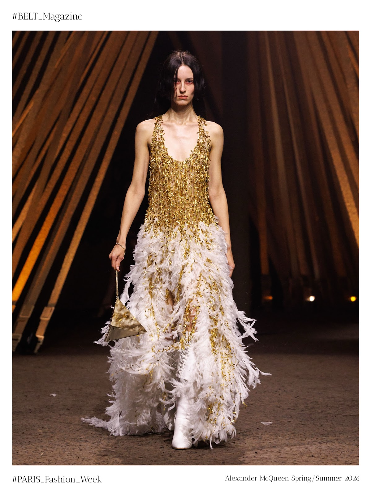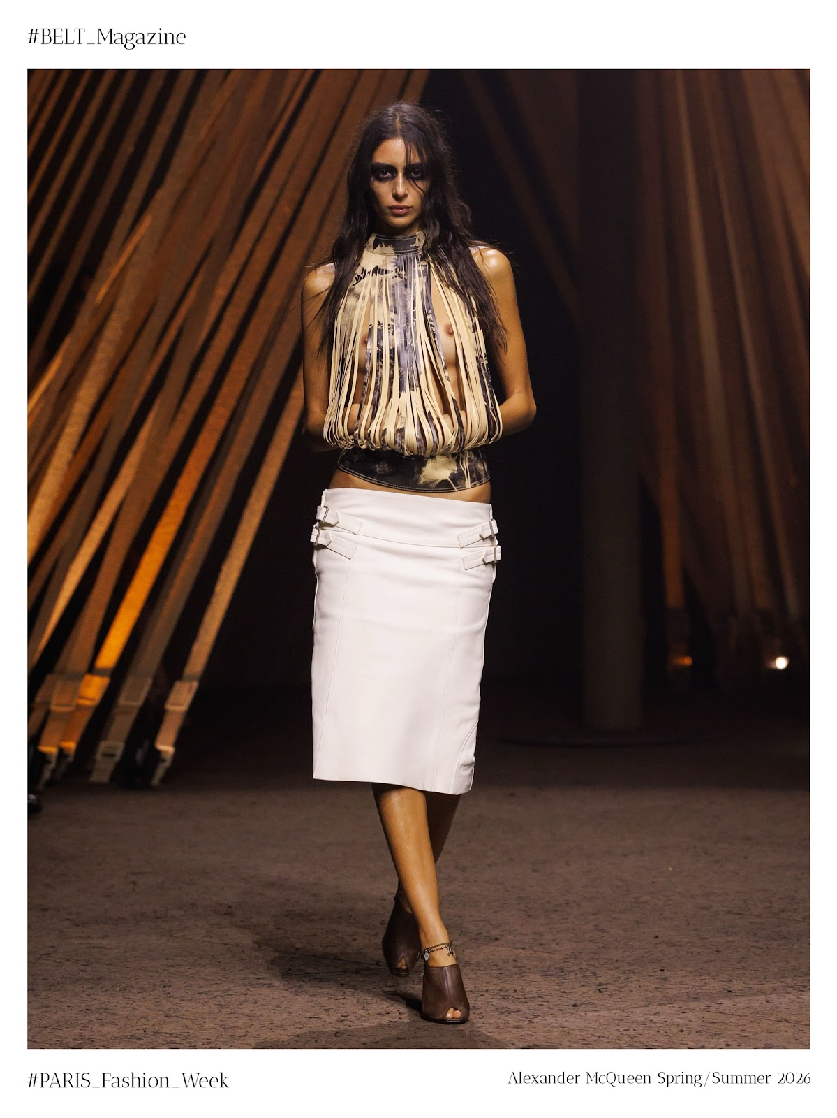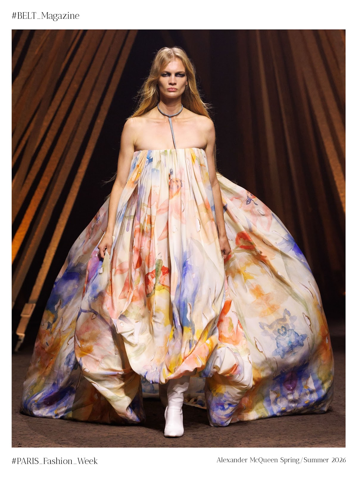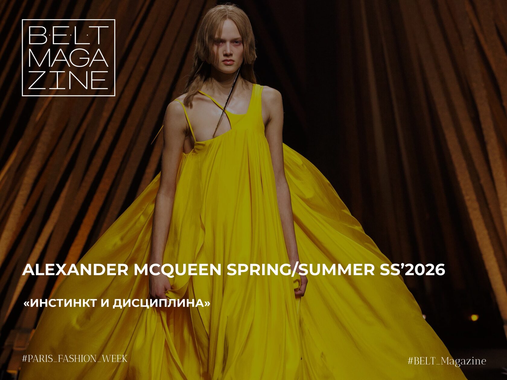 В зале — напряжённый воздух, словно перед грозой. Шон МакГир , креативный директор бренда Alexander McQueen представил коллекцию весна/лето 2026 и предложил нам диалог между инстинктом и дисциплиной: «Мы сдерживаем природу во имя порядка. А что, если уступить ей?»