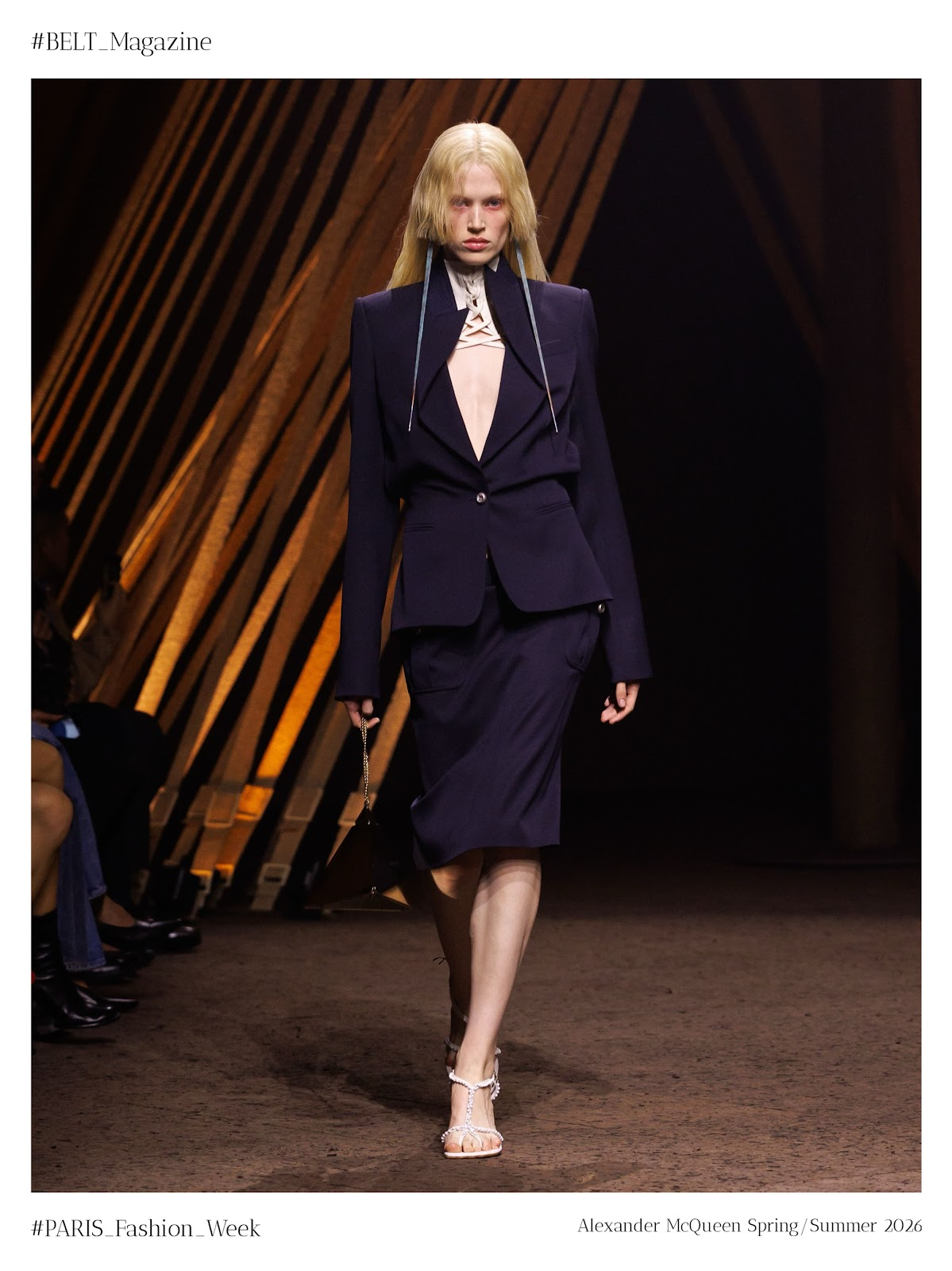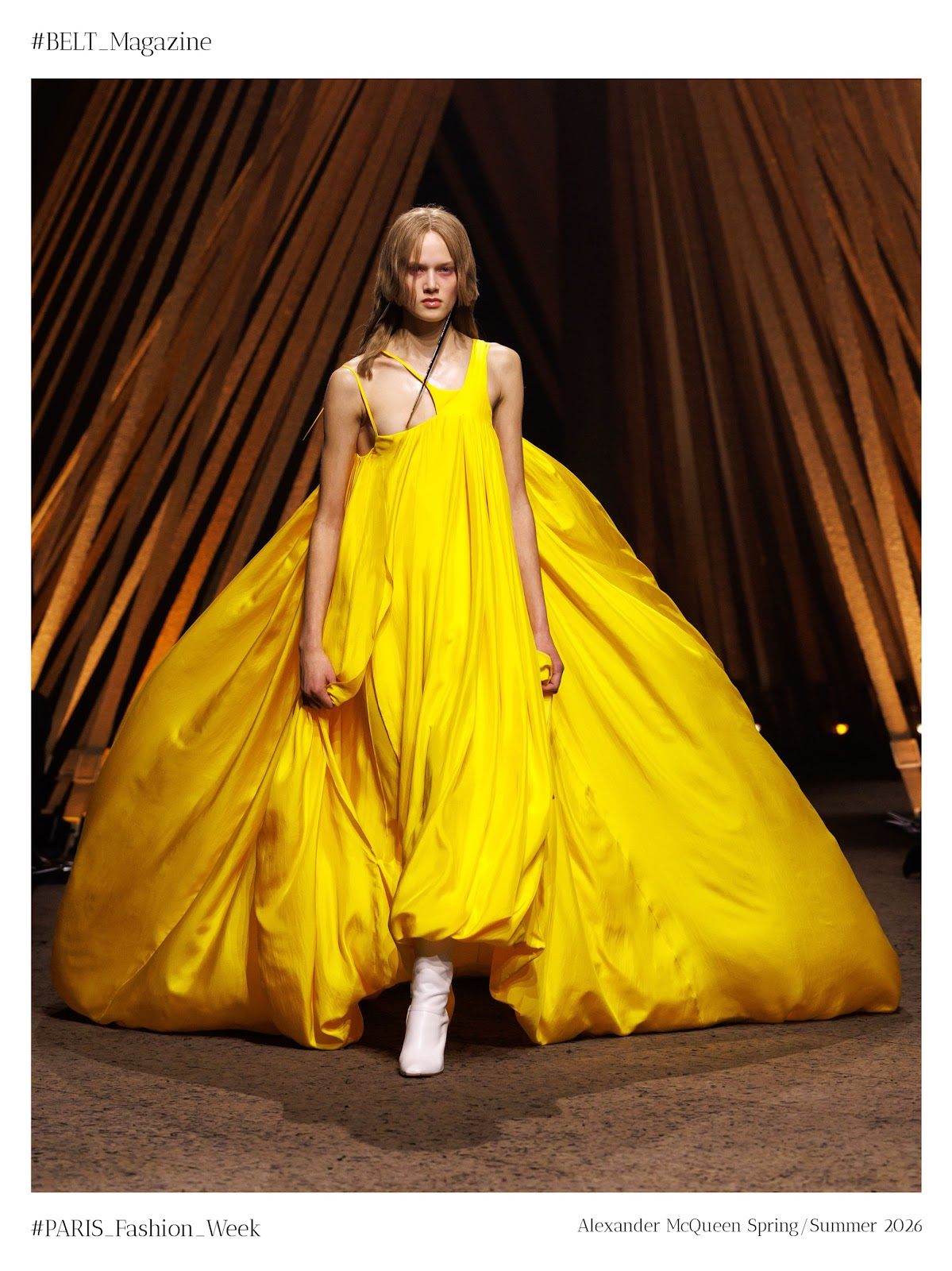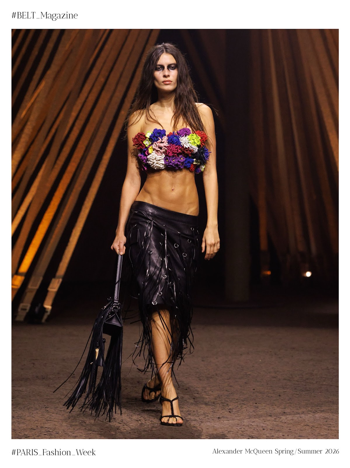 В зале — напряжённый воздух, словно перед грозой. Шон МакГир , креативный директор бренда Alexander McQueen представил коллекцию весна/лето 2026 и предложил нам диалог между инстинктом и дисциплиной: «Мы сдерживаем природу во имя порядка. А что, если уступить ей?»