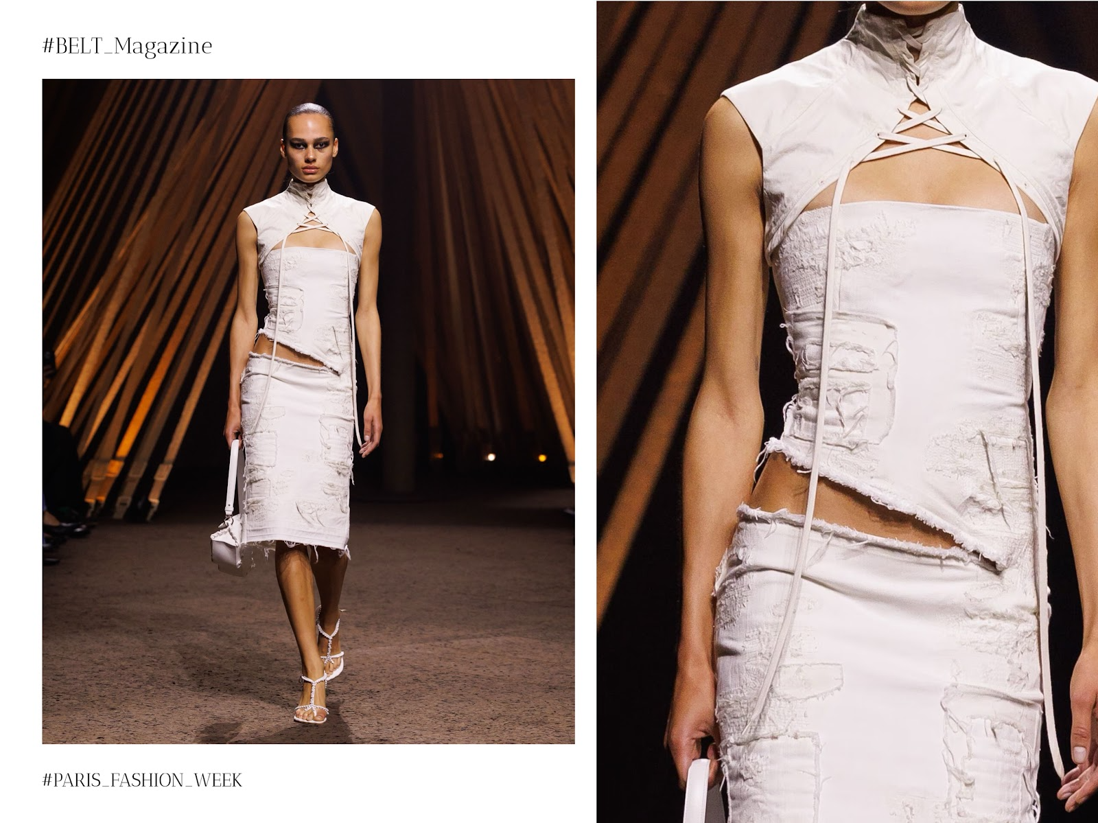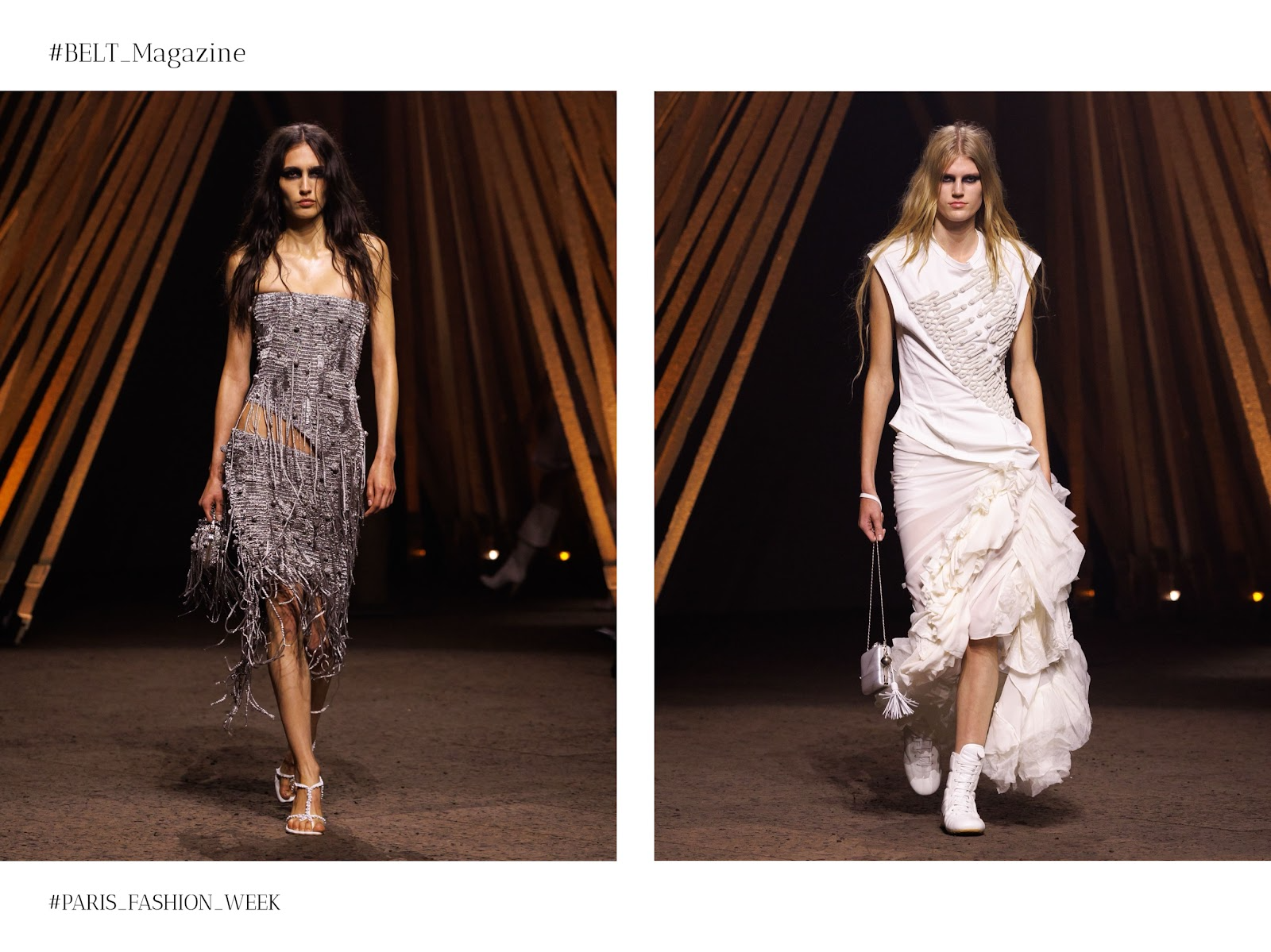 Силуэты варьируются от строго скульптурных до почти рваных: корсеты и жесткие линии соседствуют с воздушными драпировками и прозрачными слоями. Корсет здесь не скрывает фигуру — он её выдвигает на первый план.