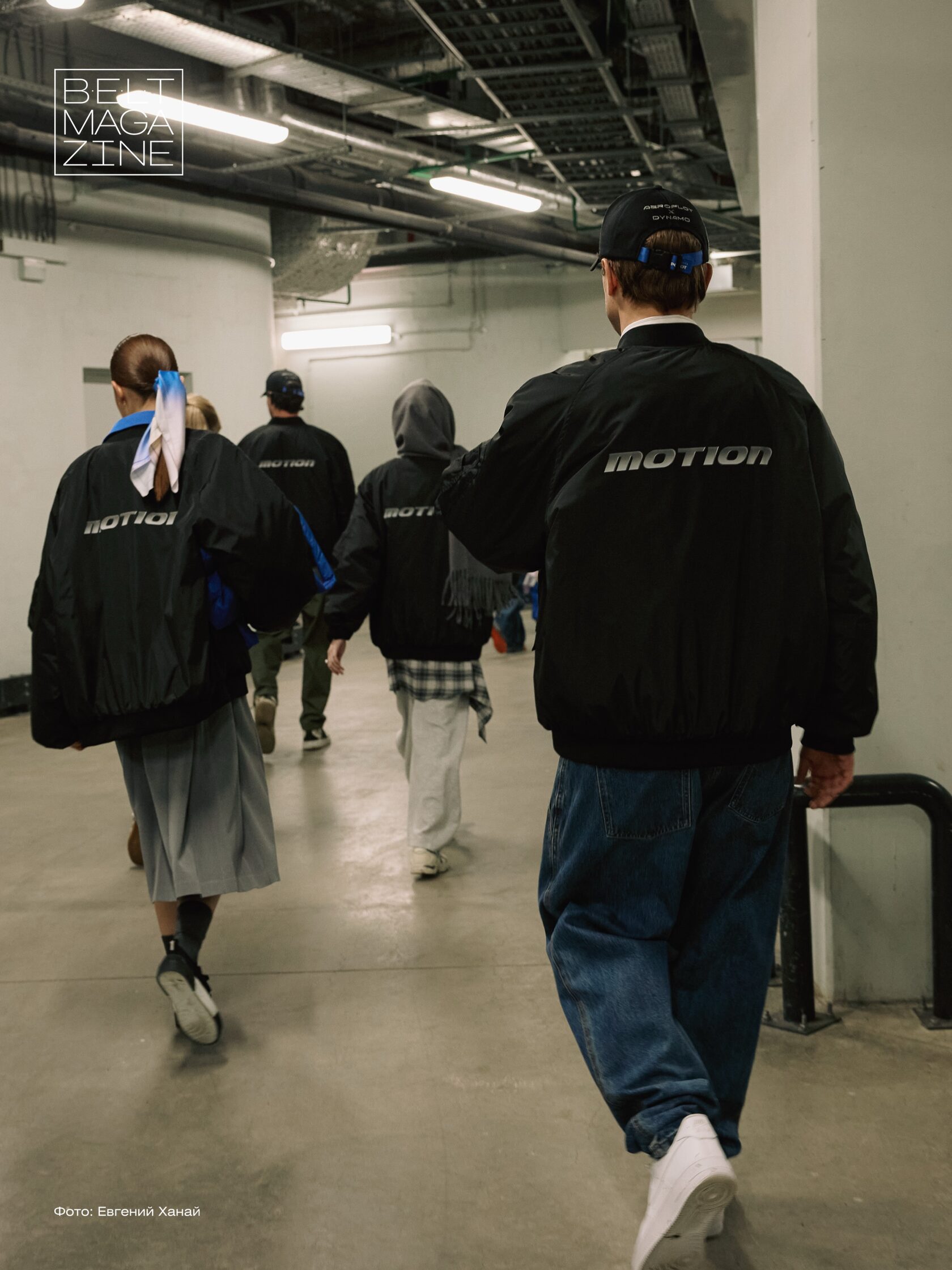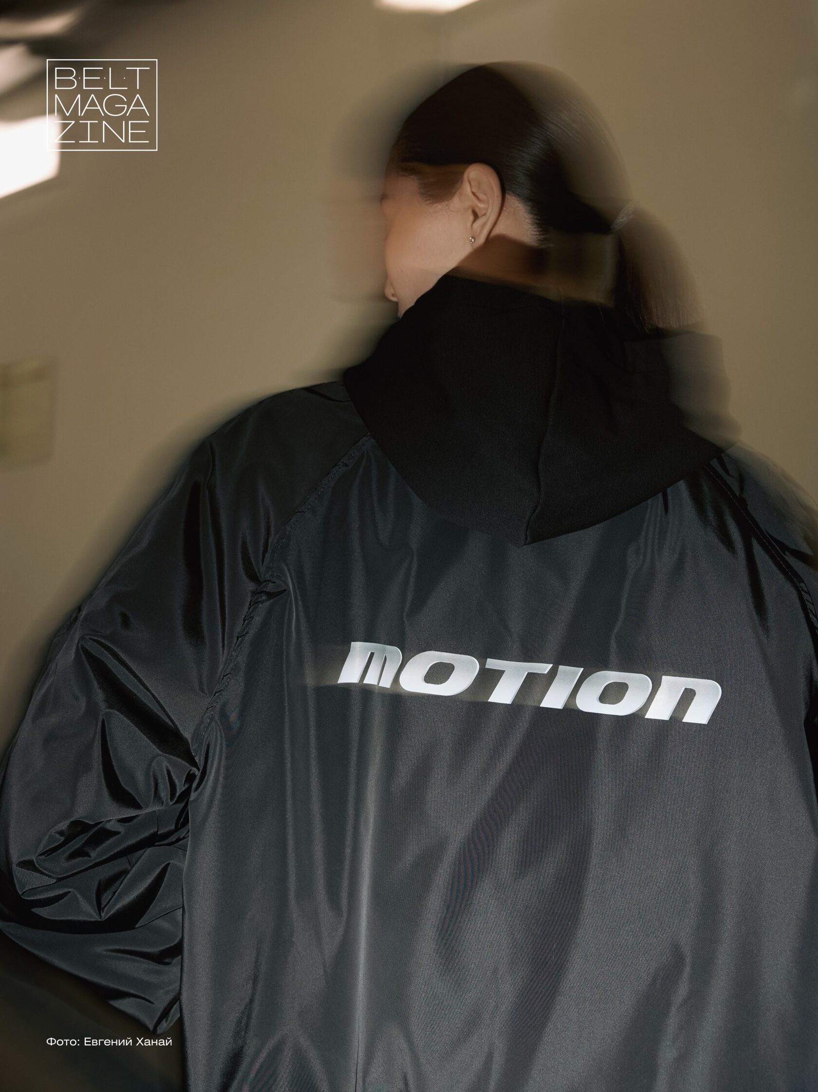 Центральным элементом коллекции стал лёгкий бомбер, который сохраняет форму, но при этом визуально остается "воздушным". На спинах — крупный логотип MOTION, выполненный шрифтом с эффектом движения, словно размытость от скорости. Такой визуальный эффект создается за счет того, что буквы как бы чуть вытянуты. Основной цвет коллекции — чёрный, который сочетают с другими тёмные нейтральными цветами. На некоторых образах присутствуют вставки градиента в синих тонах или небесных оттенках.