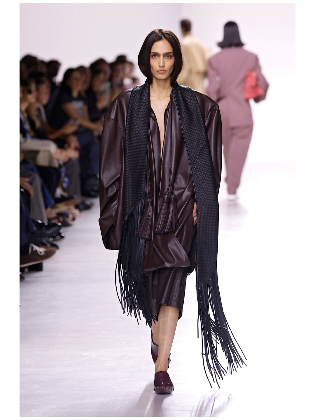 Показ открывала Анок Яй, в строгом костюме который в талии был обмотан шелковым шарфом с бахромой.