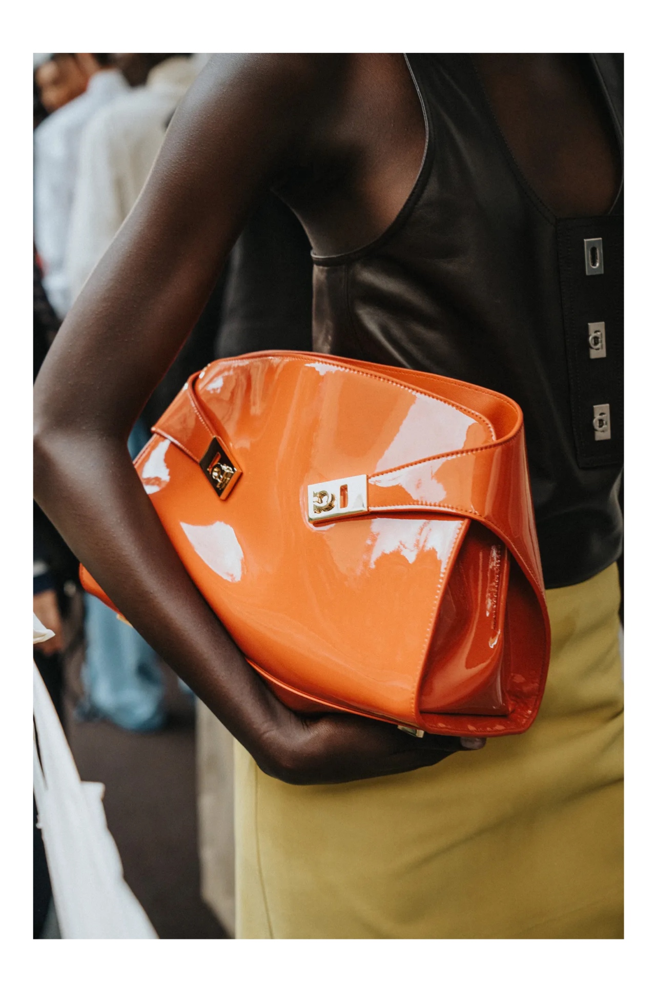Стоит отметить грамотную стилизацию и сочетание оттенков в коллекции. Хотя, сама цветовая палитра не была примечательна, но практически в каждом образе есть небольшой яркий акцент. Где то это яркая обувь, а где-то яркий выделяющийся аксессуар.