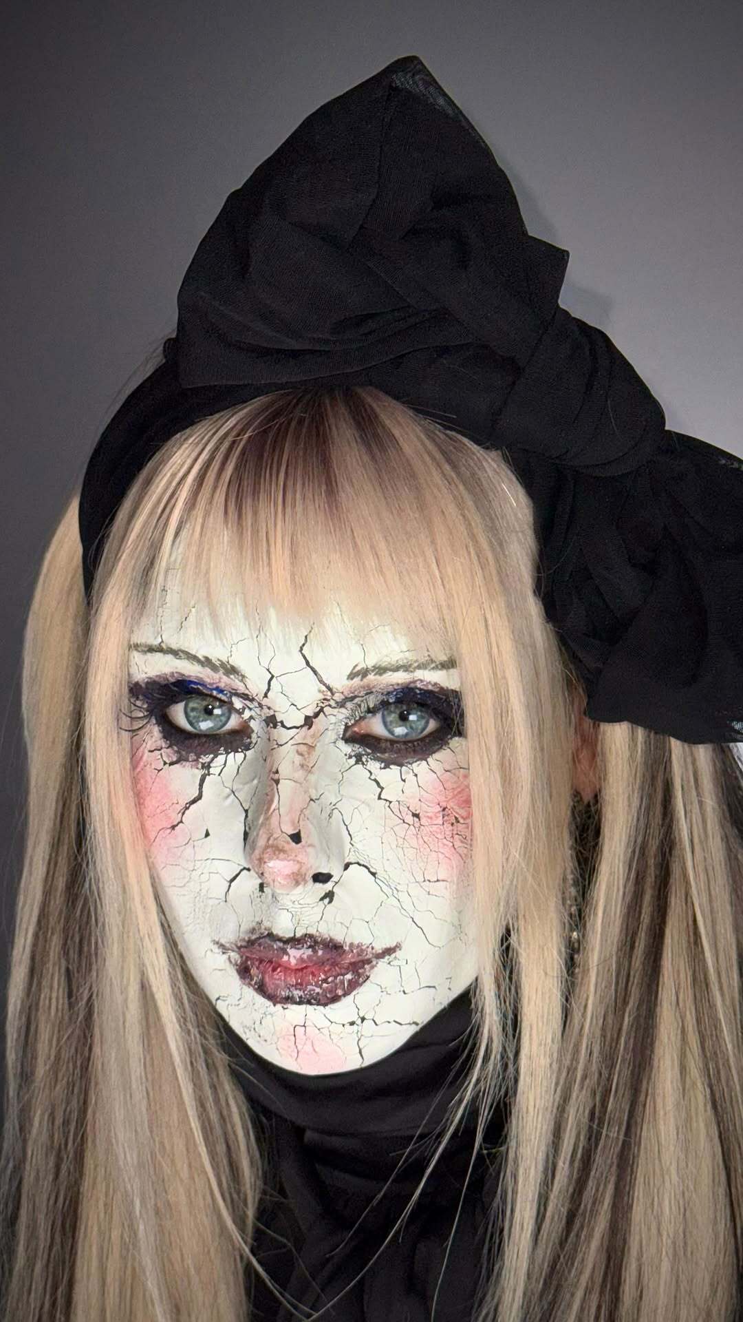 В макияже: стеклянная кожа, акцент на румянах, идеально прорисованные ресницы и чуть «пластиковый» блеск. Можно добавить эффект трещин или чрезмерно крупные глаза.