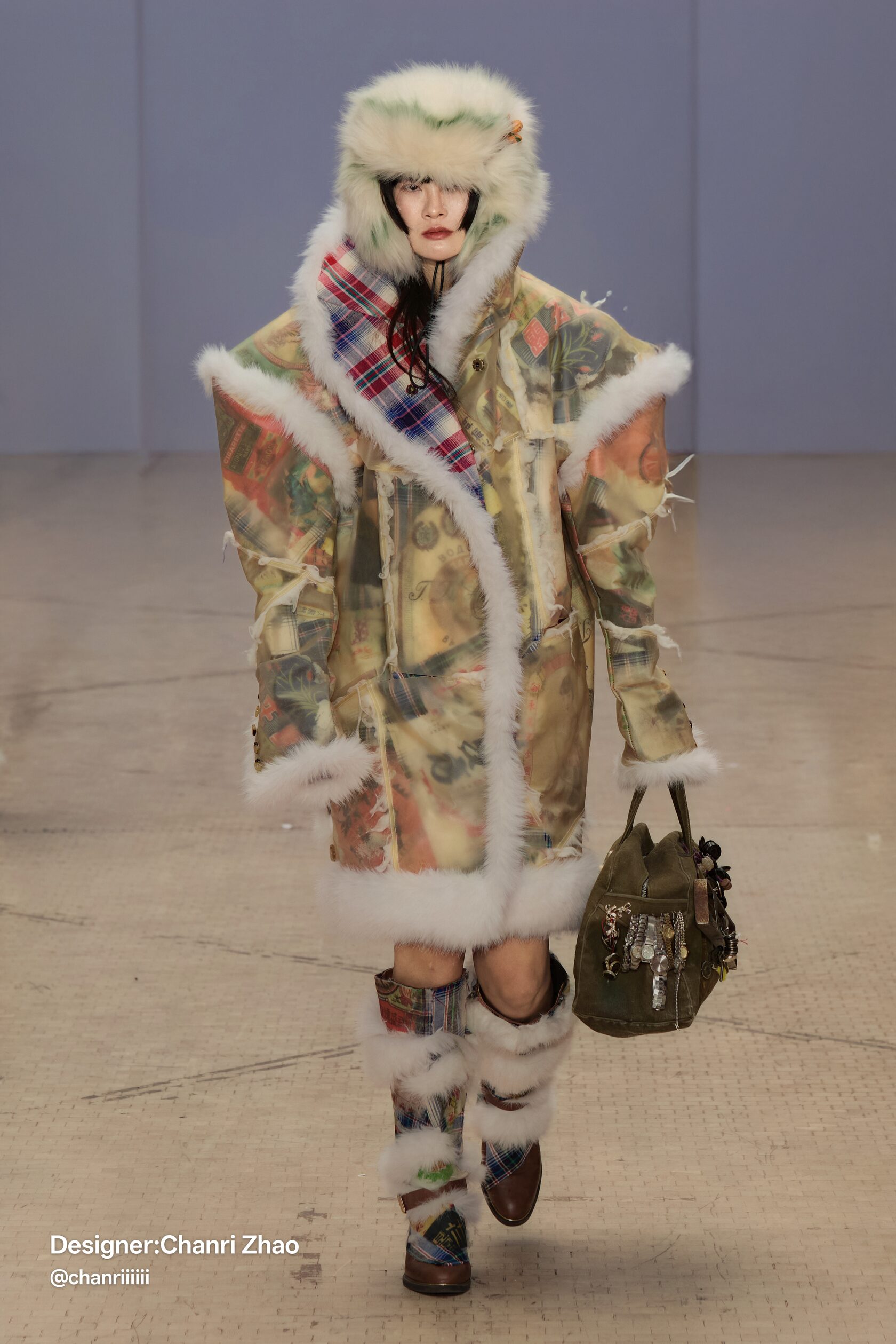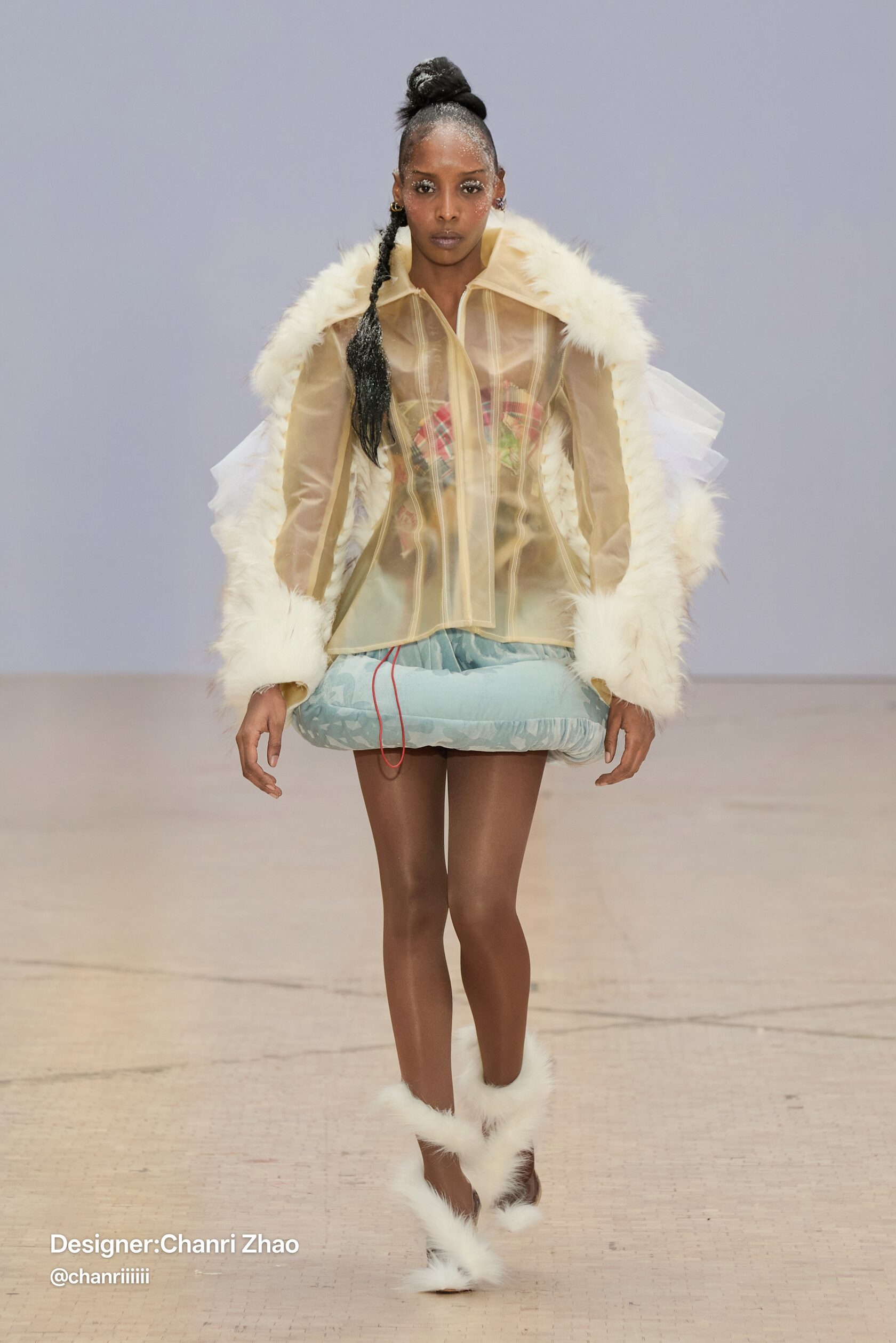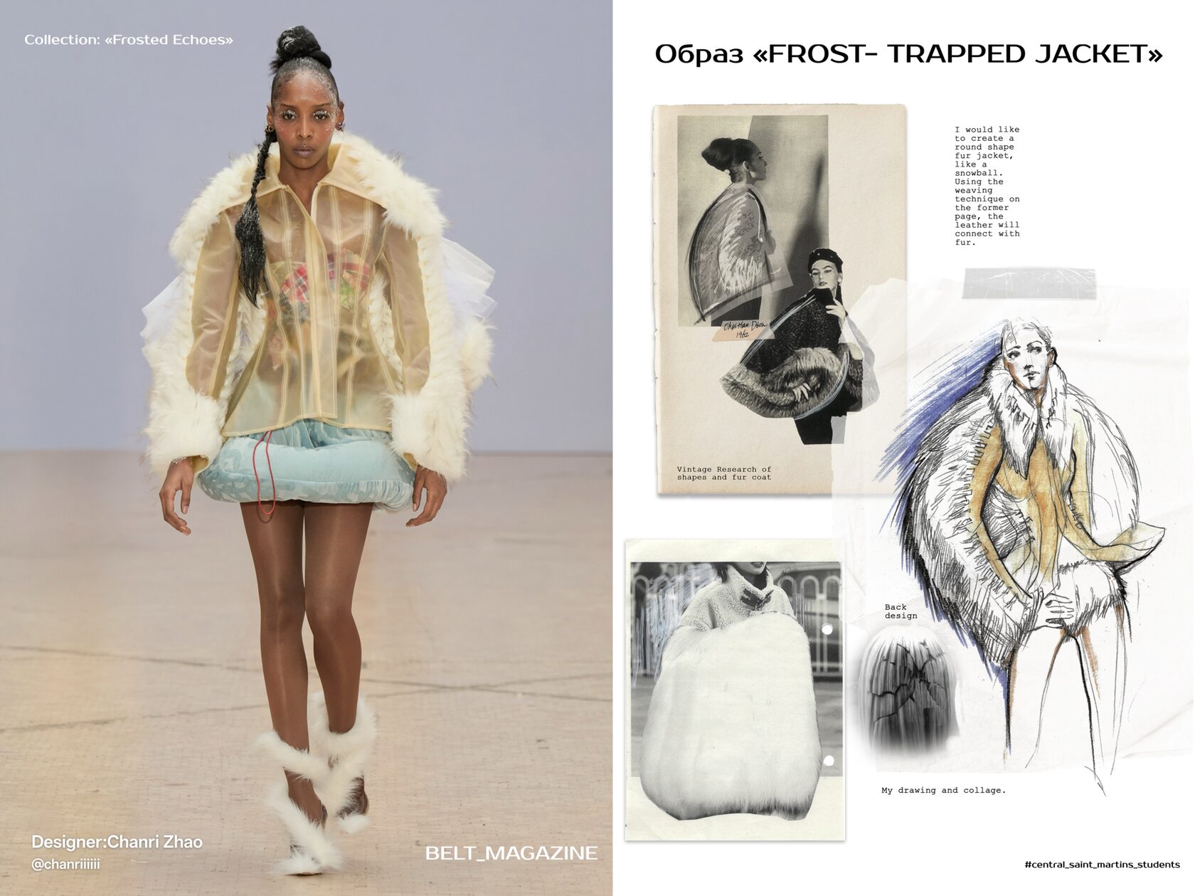 «Летом я экспериментировала, замораживая мех внутри ледяных блоков и меня завораживал контраст между мягкостью меха и твёрдостью льда. Вдохновленная этим «визуальным напряжением», я попыталась воссоздать похожий эффект и в куртке, переплетая полупрозрачную кожу с мехом. Она сохраняет модный и дерзкий вид, но в ней есть некоторое ощущение мягкости и очарования — контраст, который я нахожу особенно притягательным» — рассказала Чанри.