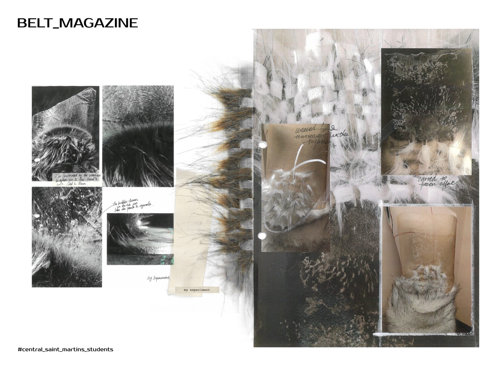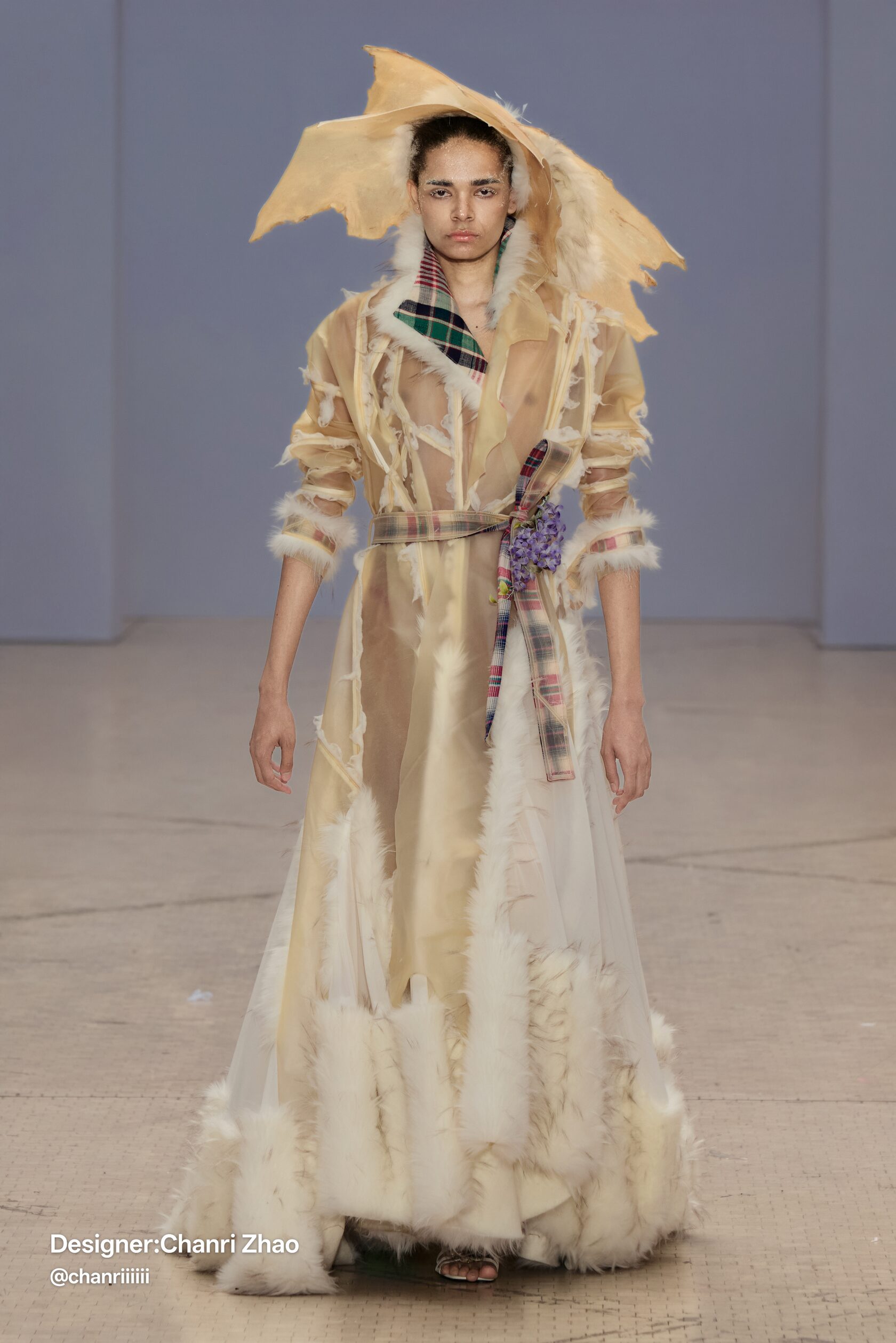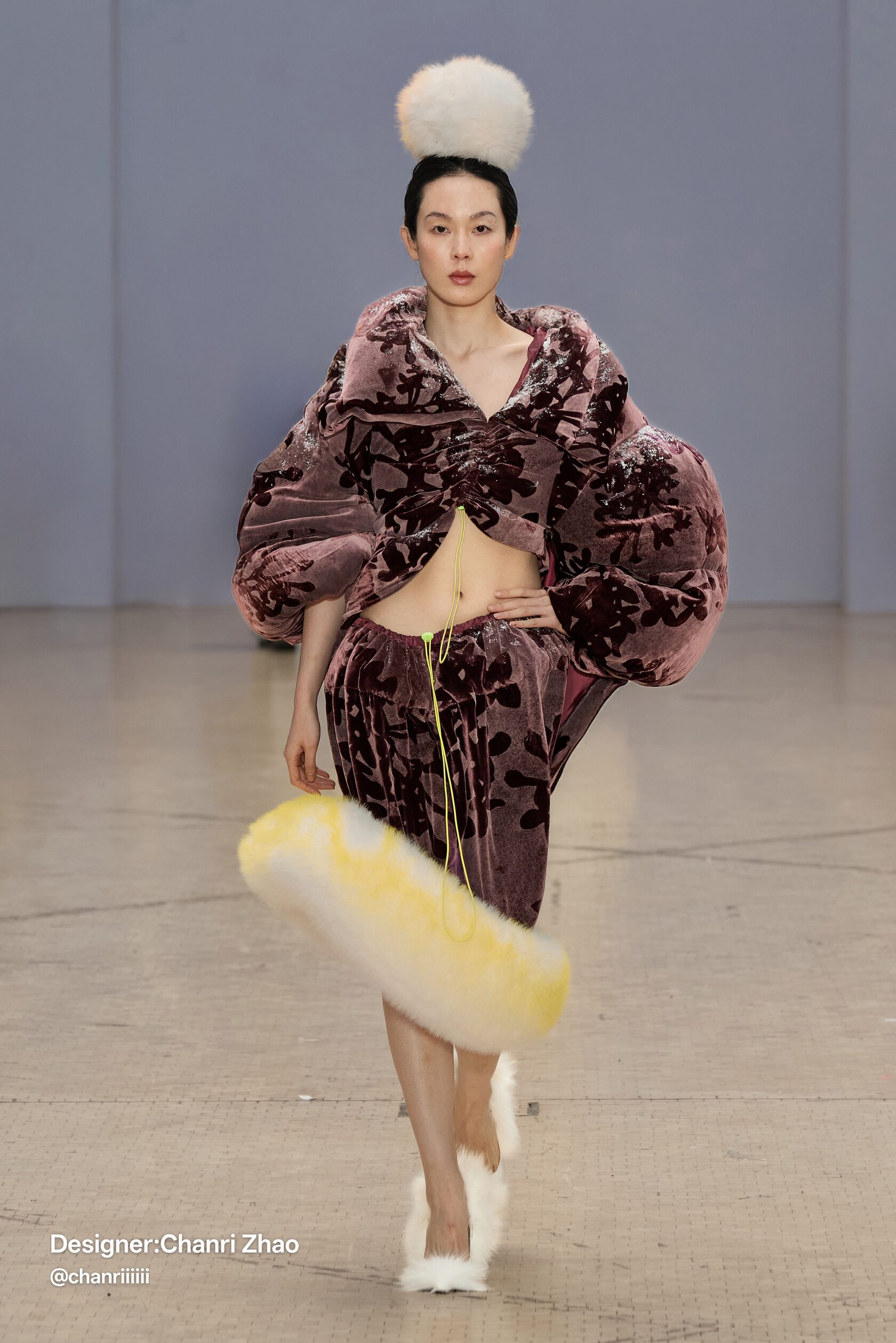 «Летом я экспериментировала, замораживая мех внутри ледяных блоков и меня завораживал контраст между мягкостью меха и твёрдостью льда. Вдохновленная этим «визуальным напряжением», я попыталась воссоздать похожий эффект и в куртке, переплетая полупрозрачную кожу с мехом. Она сохраняет модный и дерзкий вид, но в ней есть некоторое ощущение мягкости и очарования — контраст, который я нахожу особенно притягательным» — рассказала Чанри.