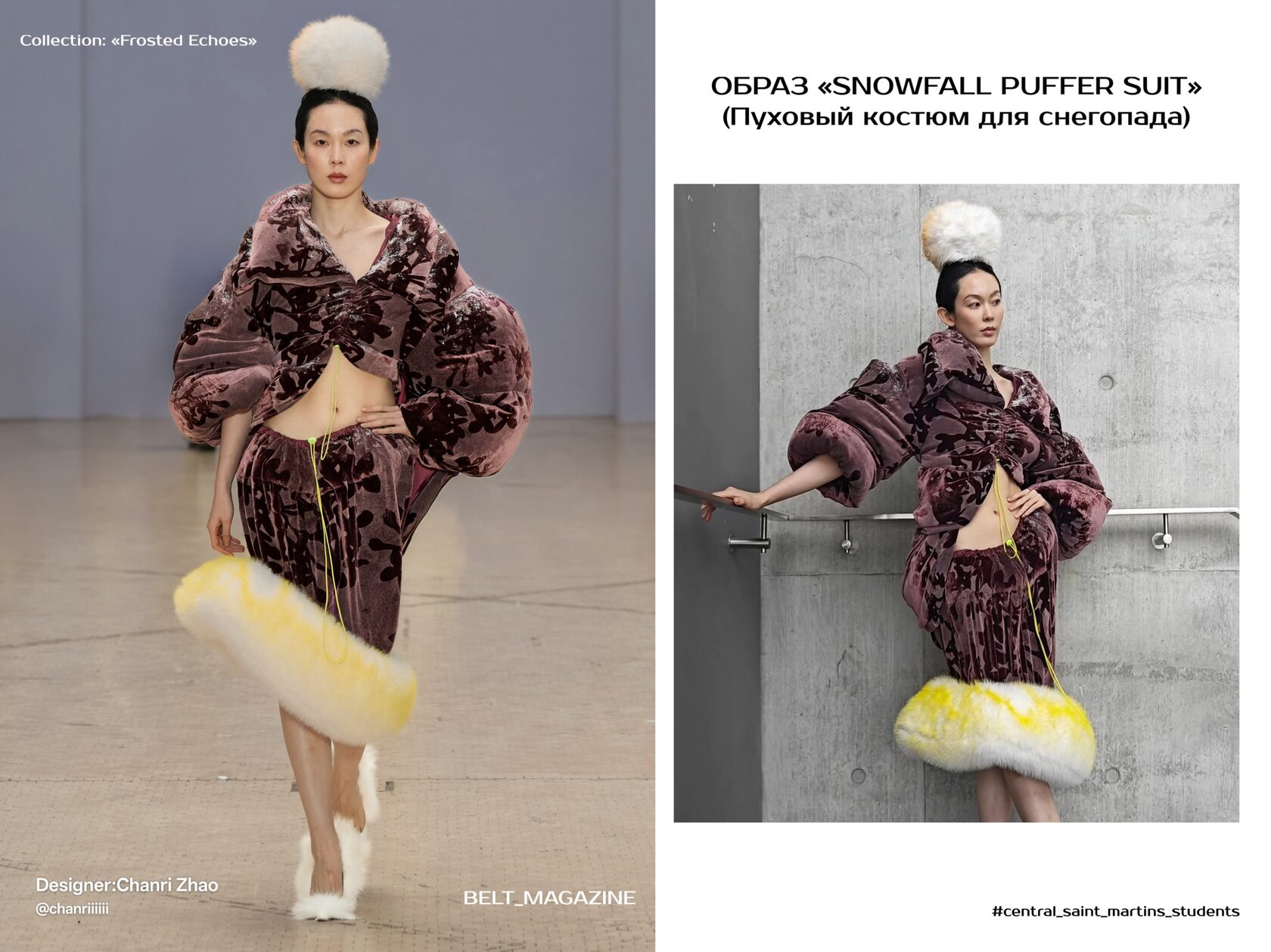 Зимняя мода в Харбине неразрывно связана с культовой пуховкой. Чанри хотела переосмыслить этот утилитарный элемент через призму своей эстетики, наполнив его духом винтажной элегантности. Нежные снежинки украшали бархатную ткань, создавая тонкие вариации текстуры — словно мягкие мазки времени на полотне.