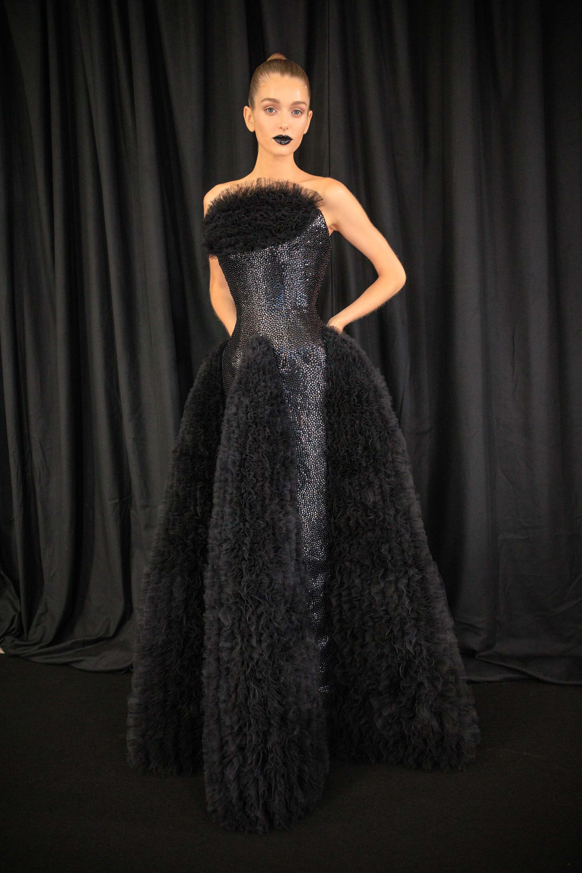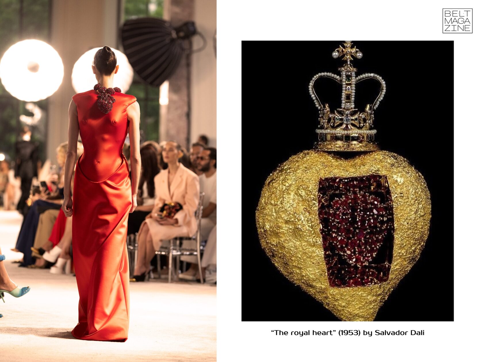 Начнем с бьющегося сердца, которое больше всего привлекло внимание зрителей и инфлюенсеров. Показы Schiaparelli без эстетики Сальвадора Дали уже невозможно представить. В этом образе например Дэниел Розберри вдохновлялся ожерельем «Королевское сердце» Сальвадора Дали 1953 года, которое точно также пульсирует, создавая иллюзию, что сердце бьется. Оно идеально сочетается с атласным платьем, которое словно надето задом наперед.
