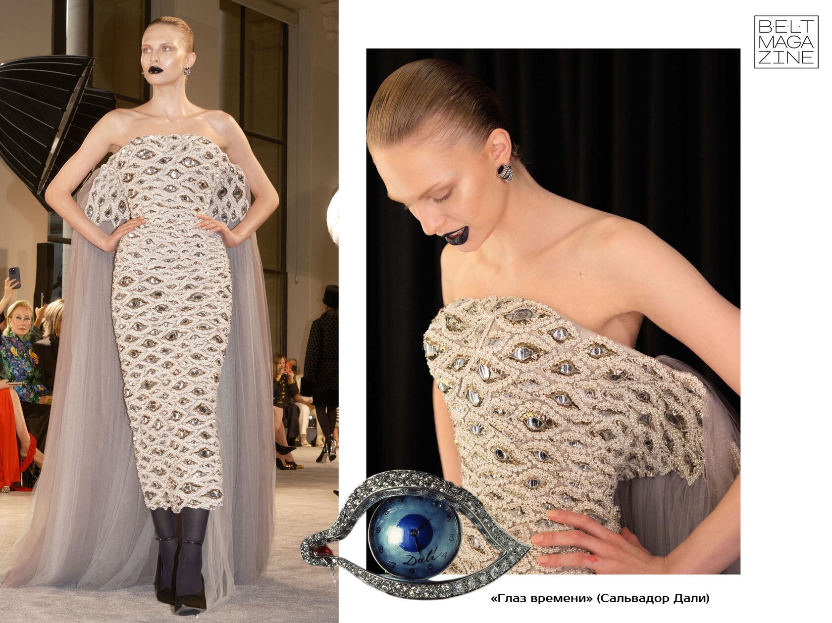 Платье, усыпанное «глазами Сальвадора Дали». Нет, вам не показалось. Это прямая отсылка к знаменитой броши «Глаз времени», которую Сальвадор Дали подарил своей жене и музе — Гале.