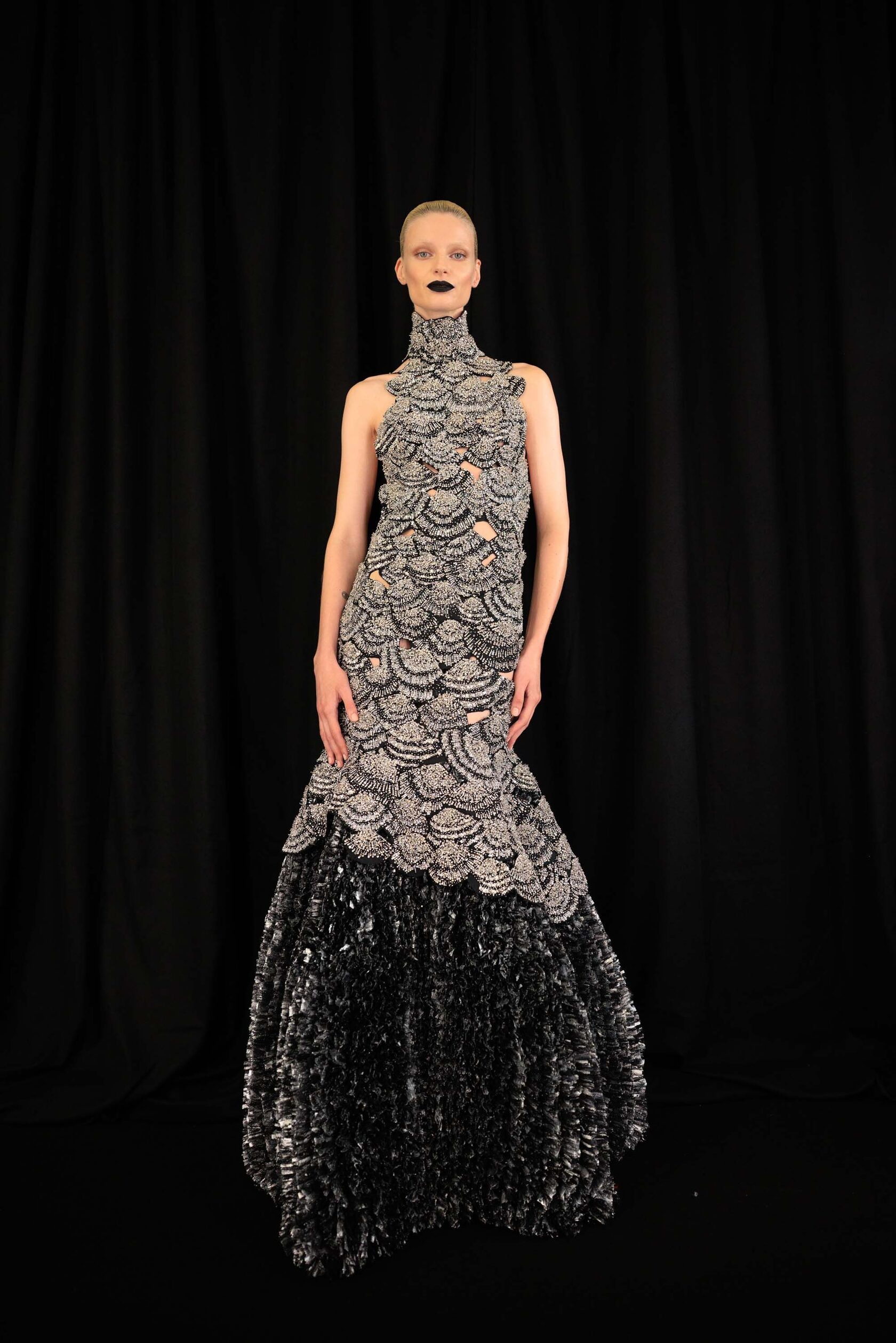 Волшебным образом, знаменитая вышивка от накидки Аполлона Версальского, превратилась в огромное украшение, которое сочеталось с длинным черным платьем.