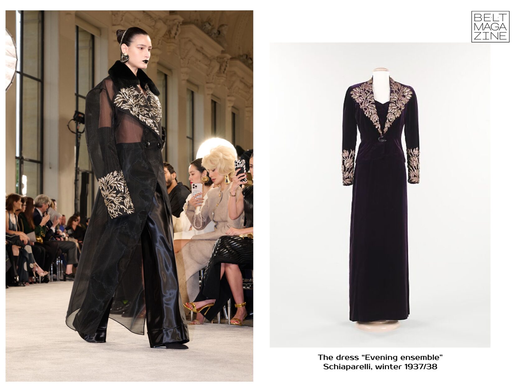 Архивное платье «Evening ensemble» также появляется на подиуме в новой интерпретации. Вернее сказать, теперь это прозрачное пальто, на котором осталась та самая причудливая вышивка от платья 1937 года.