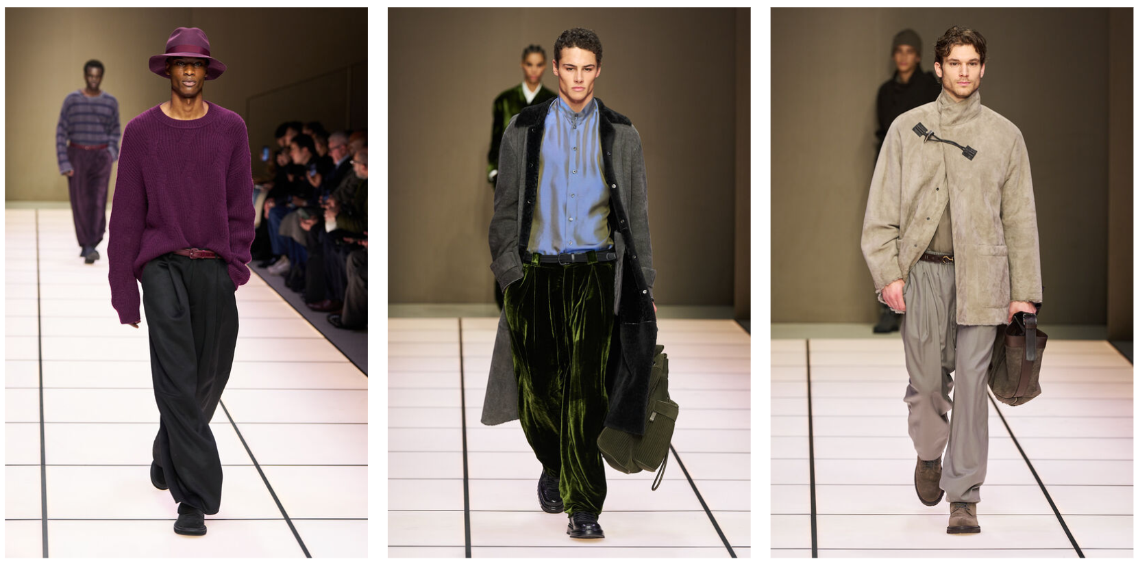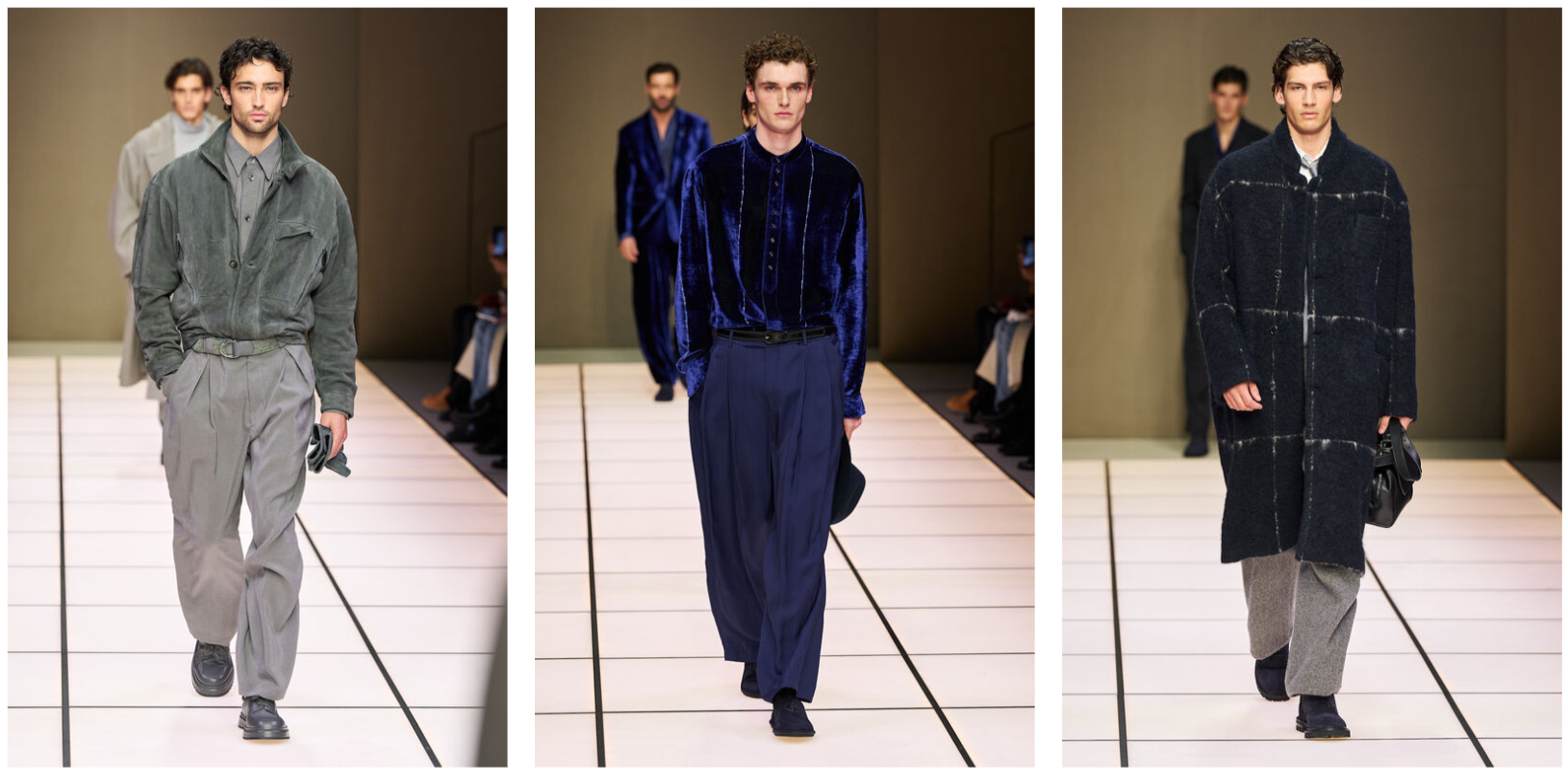 Бренд продолжает играть с темой 80-х, что не удивительно. Именно в эту эпоху и произошел расцвет силуэта Armani.