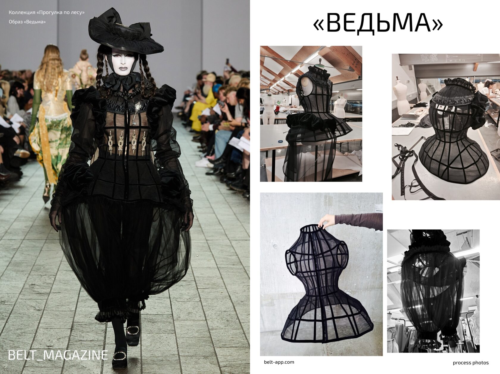 "Что касается пошива, то внутренняя структура (каркас) этого образа начала формироваться еще в ноябре, и я работал над ним с перерывами до тех пор, пока за месяц до показа нам не дали зелёный свет на производство всех элементов. Мне очень нравится образ бабы яги и я хотел интерпретировать его для бельгийского фольклора. Что означает ключ на груди? Во многих историях и рассказах о ведьмах, которые я читал во время своих исследований, упоминались ключи и замочные скважины, которые могла открыть только ведьма. Поэтому это некая отсылка на это».