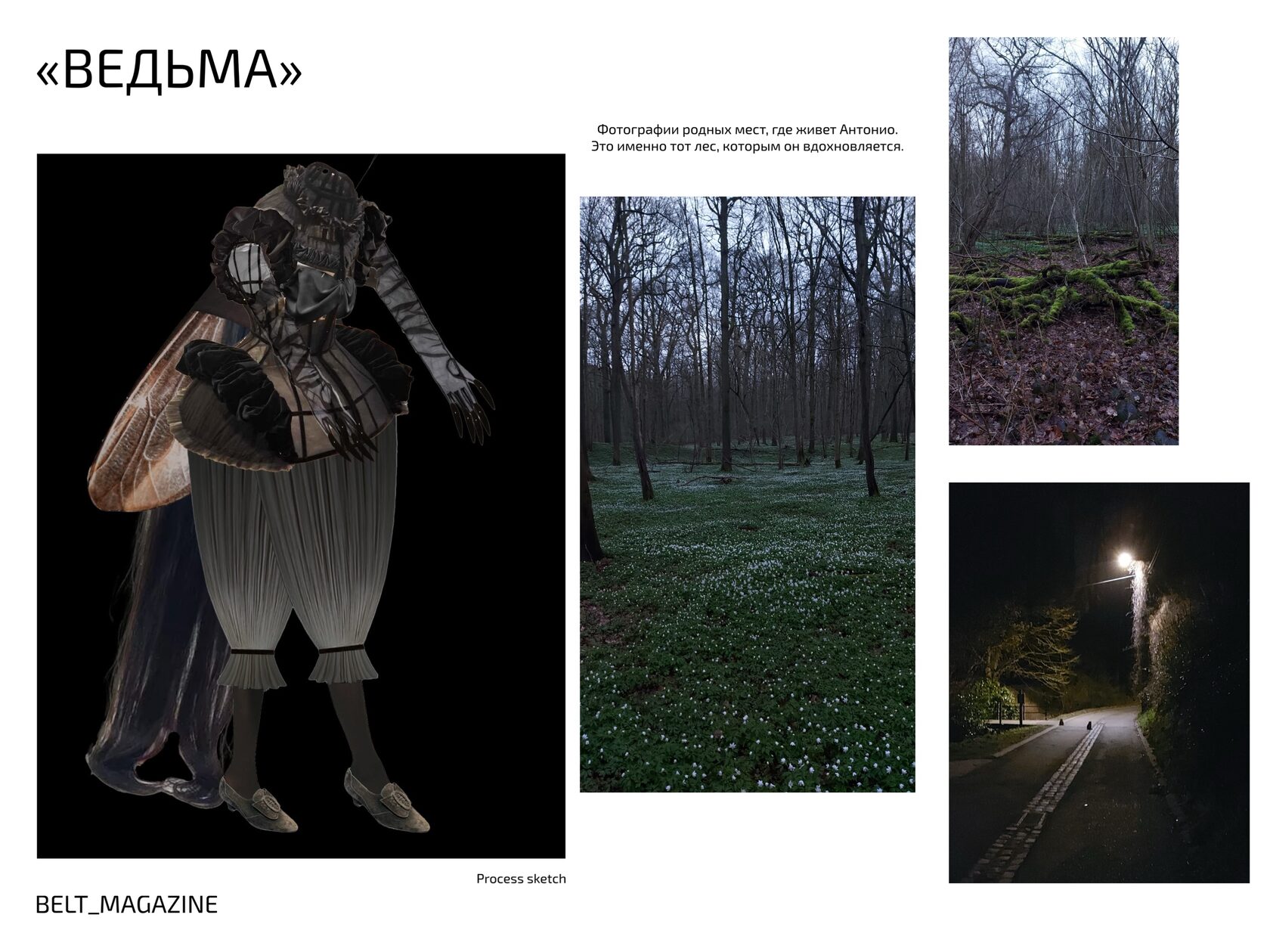 Его выпускная коллекция под названием «Прогулка по лесу» — это симбиоз искусства, моды и природы. Антонио рос в Бельгии в городе Ам-Миль, окруженном лесами. Поэтому его вдохновляет лес, природа, цветы и все, что с этим связано. Мы попросили Антонио рассказать нам о трех образах: «Улитка» («The snail»), «Тайный сад» («The secret garden»), «Ведьма» («The witch»).