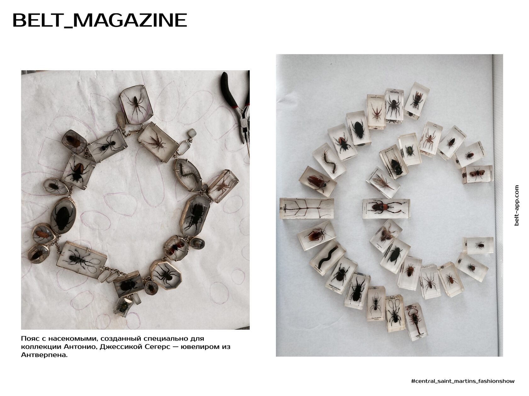 Пояс с насекомыми сделала Джессика Сегерс, - ювелир из Антверпена. Антонио дал ей насекомых, запечатанных в смолу, которых он купил на блошиных рынках, и она отполировала их, как настоящие драгоценные камни, чтобы сделать ожерелье, которое в итоге было переработано в пояс.