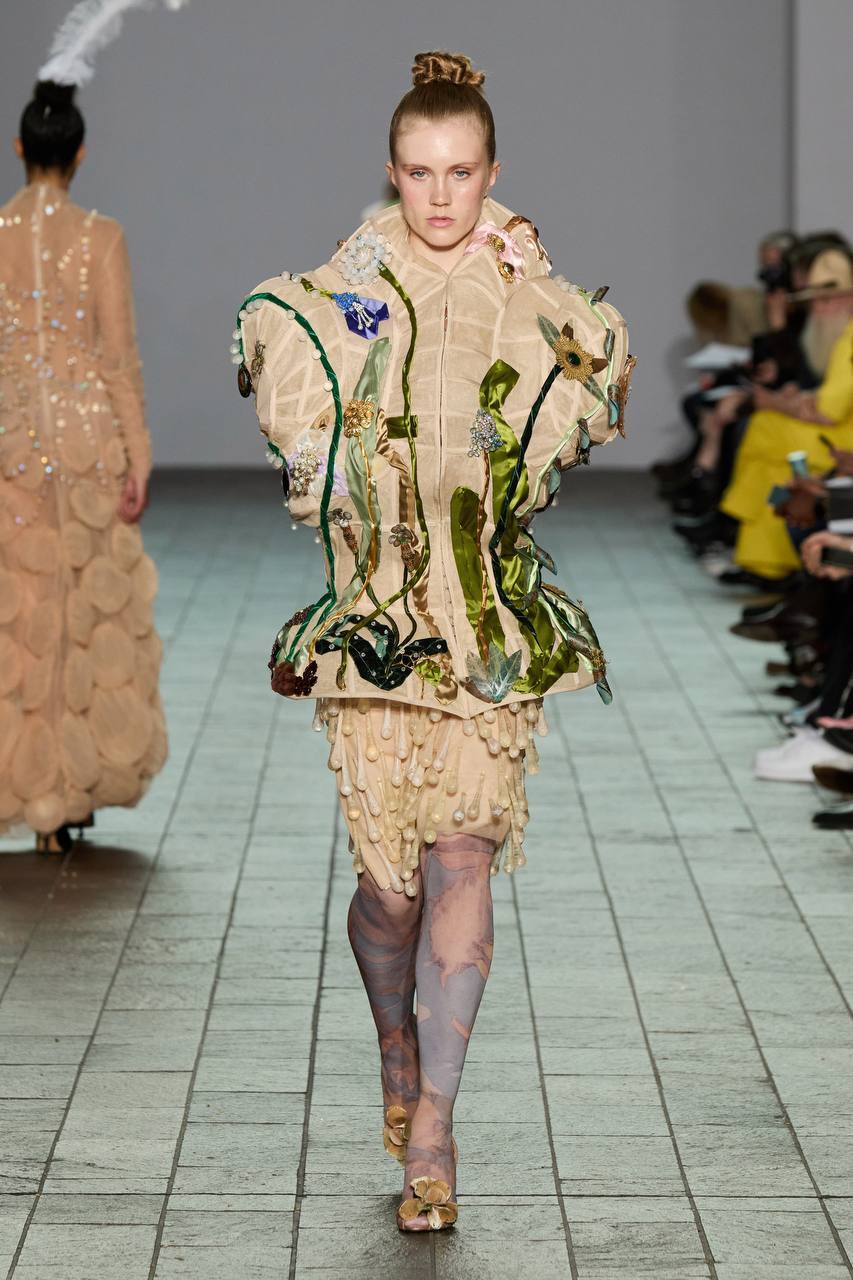 Пожалуй, это одна из самых запоминающихся коллекций с прошедшего показа Central Saint Martins, отражающая красоту флоры и фауны, которую мы, к сожалению, не всегда замечаем в нашем активном ритме жизни.