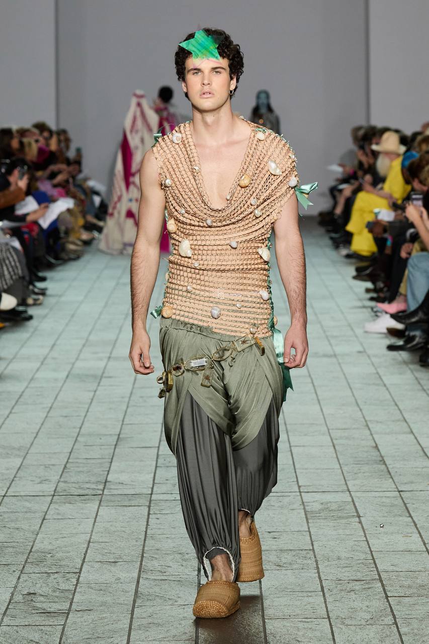 "При его создании я в основном вдохновлялся улитками. Там, где я живу, много леса вокруг и сезон, когда выползает много улиток очень длинный. При создании образа я использовал высушенных улиток, которых нашел, чтобы вышить из них топ, а также пошил драпированные штаны, имитирующие след слизи, который оставляют улитки""- делится Антонио.