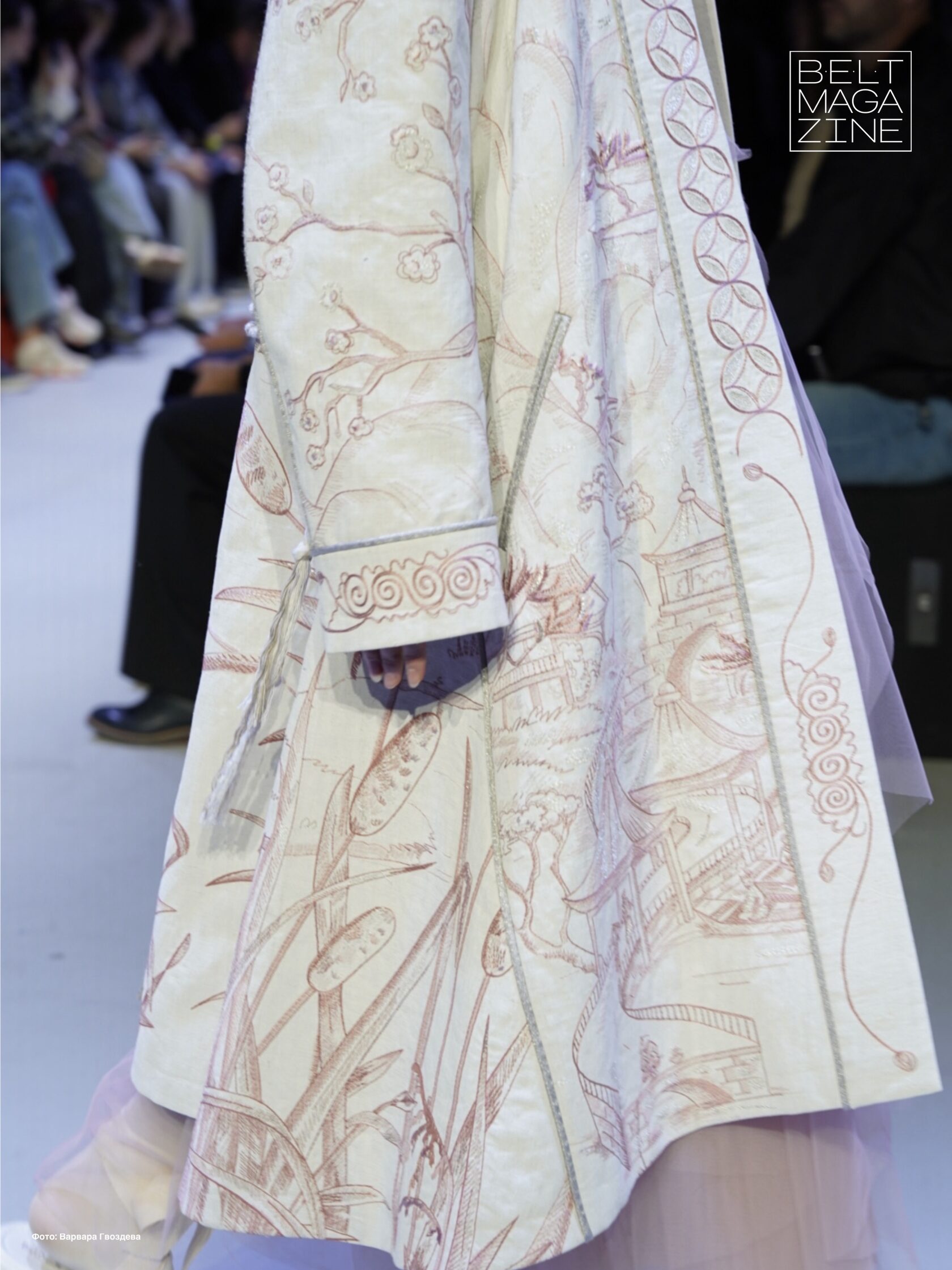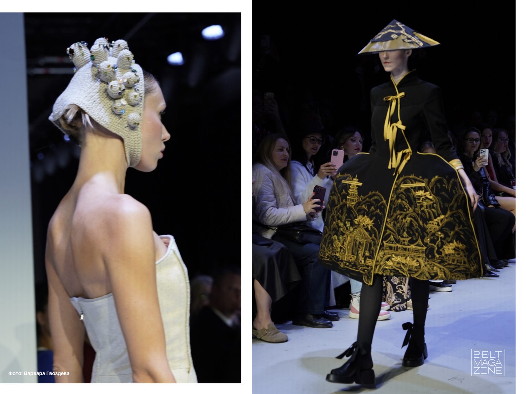 Коллекция называлась «LA LAQUE NOIRE» (Черный лак). Она отсылает нас к стилю шинуазри, который считается одним из самых «тонки» в декоративном искусстве. Азиатская эстетика во всей красе. Но тут не только Азия. Вся коллекция- это сочетание контрастов: «французские панье встречается с элементами традиционного русского костюма, монументальные пальто напоминают антикварные китайские бюро, а золотая вышивка заполняет поверхность одежды точно восточная мифология, драгоценно расписанная на ширмах и панно».