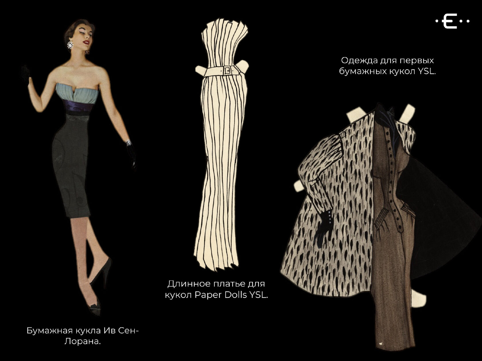 Главный партнер Ива Пьер Берже в свое время открыл архивы Сен-Лорана, чтобы люди, которые изучают историю моды могли окунуться в бренд с головой. Очень интересен раздел Paper Doll: в нем представлены 11 бумажных кукол дизайнера, у которых есть различного рода наряды.