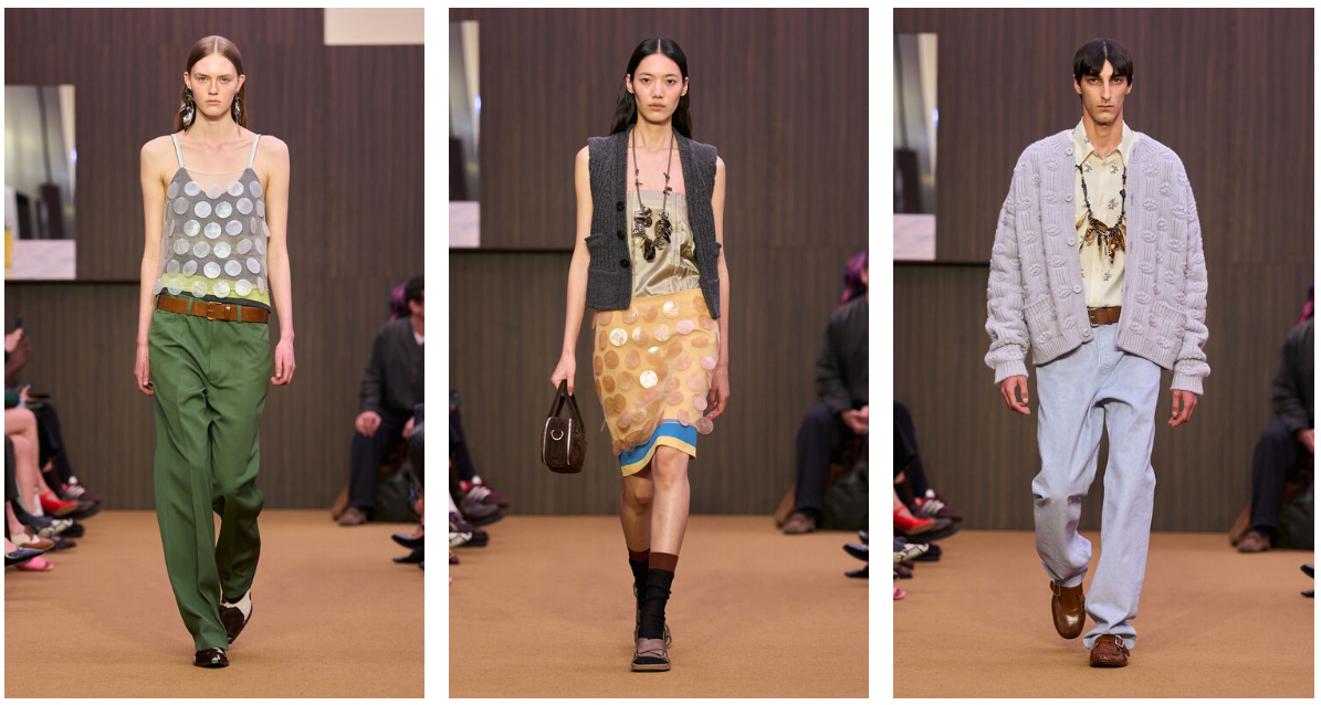 На Prada Миучча и Раф удивили почти театральным подходом: шоу прошло в формате hyper-edited — всего 15 моделей представляли 60 образов, снимая или добавляя плащи, свитера и юбки прямо на подиуме, словно раскрывая концепцию «разных личностей в одном гардеробе».