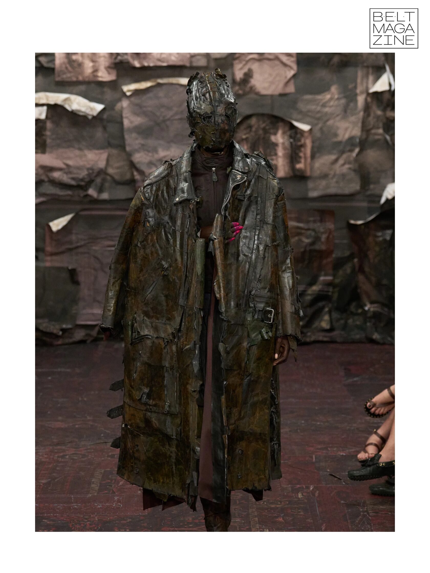 С масками Гленн решил повысить градус и сделать их не просто полупрозрачными тканевыми вуалями на лицах моделей, какие были в первом показе тогда еще Maison Martin Margiela, а создать некоторые из них из материалов, не пригодных к созданию одежды в принципе, не говоря уже о масках. Так, он сделал медные маски, пробив в листе металла едва заметные отверстия и прорези для глаз. Остальные маски, может быть, и менее брутальные, но все-таки тоже полностью скрывают лица моделей, невольно задумываешься, а видят ли они вообще хоть что-то?