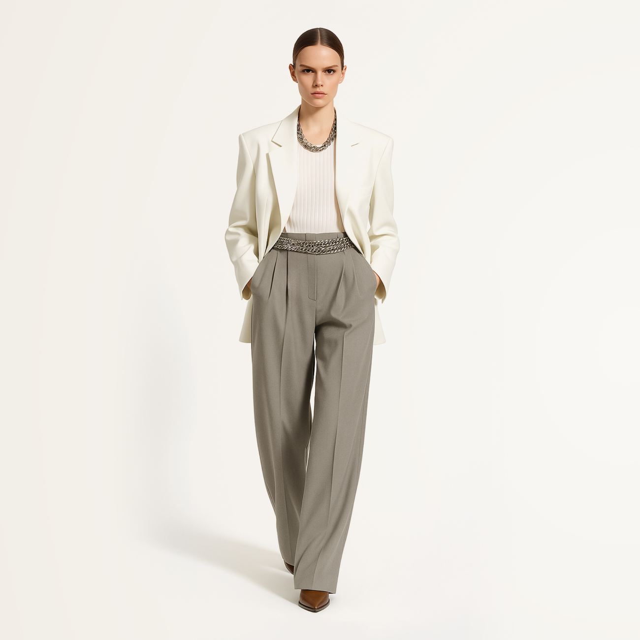 The style is grounded in clean, classic tailoring with a touch of minimalism. Expect straight and structured silhouettes, sharp lines, and simple shapes that flatter without overcomplicating. Oversized pieces can be incorporated, but they always appear intentional and polished, contributing to an effortlessly chic and comfortable city look.