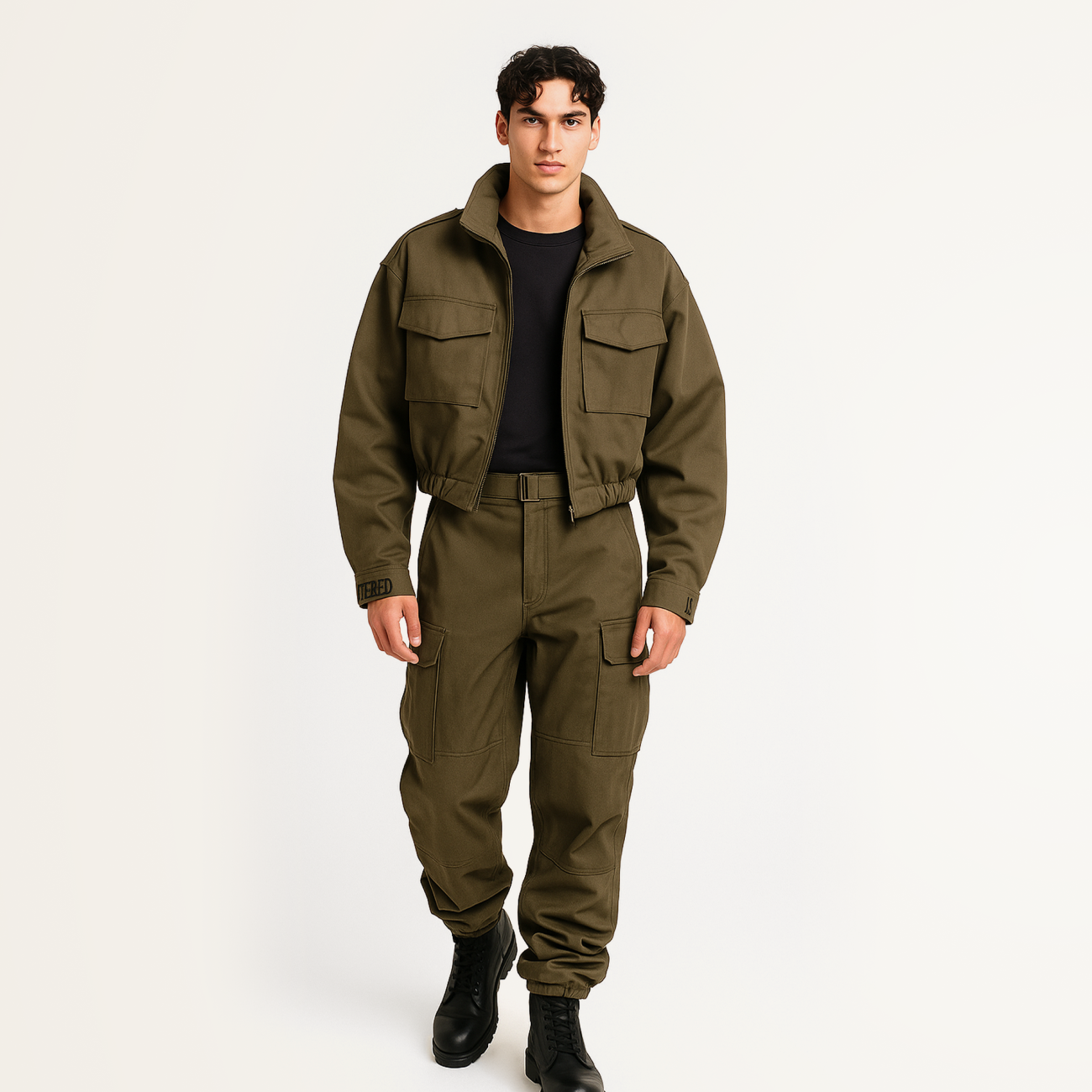 Прямые и удобные силуэты с акцентом на утилитарность и многослойность — ключ кроя милитари стиля. Пиджаки, куртки, пальто и брюки часто имеют структурированный вид, в них используются накладные карманы, застежки на молнии и ремни. Крой позволяет создавать образы, которые одновременно подчеркивают силу и свободу движений.
