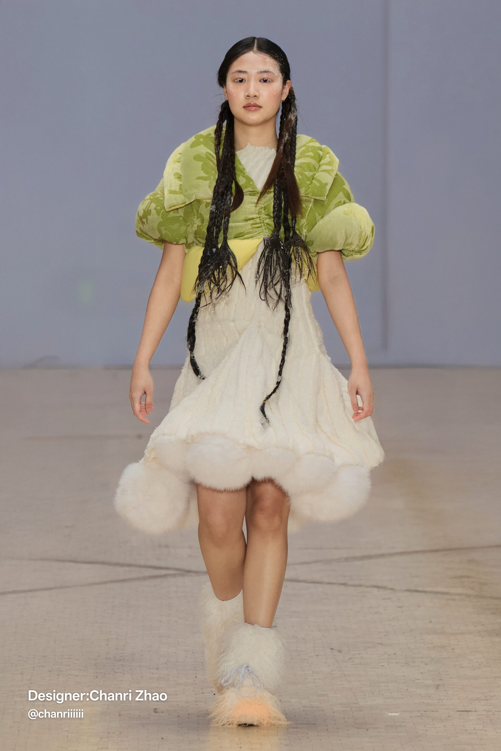 "During the summer, I experimented by freezing fur inside ice blocks, and I was captivated by the contrast between the softness of the fur and the hardness of the ice. Inspired by this 'visual tension,' I tried to recreate a similar effect in the jacket by intertwining semi-transparent leather with fur. It maintains a fashionable and bold appearance, but there is also a sense of softness and charm — a contrast that I find particularly appealing," Chanri shared.