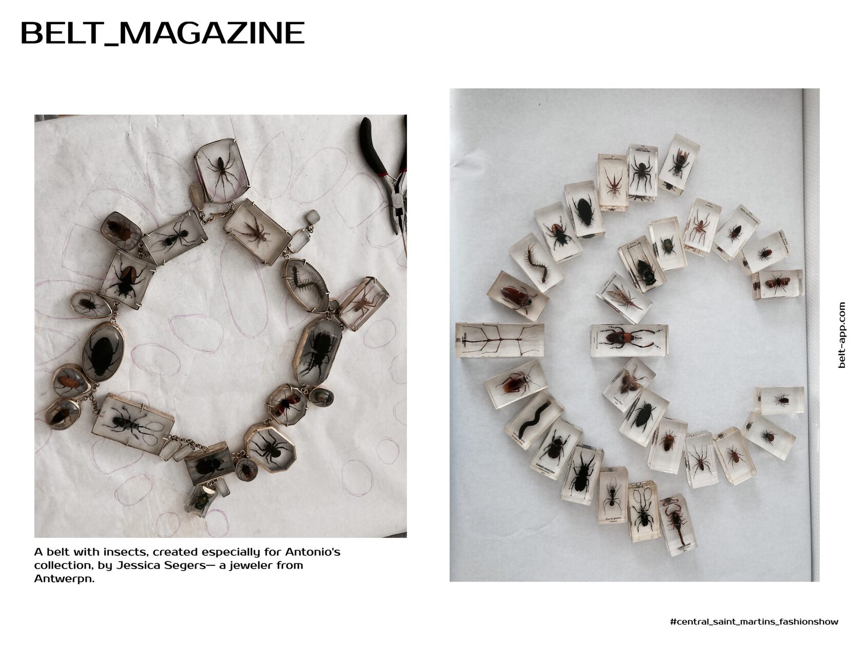 The belt with insects was made by Jessica Segers, a jeweler from Antwerp. Antonio gave her insects encased in resin that he bought at flea markets, and she polished them like real gemstones to create a necklace that was eventually redesigned into a belt.